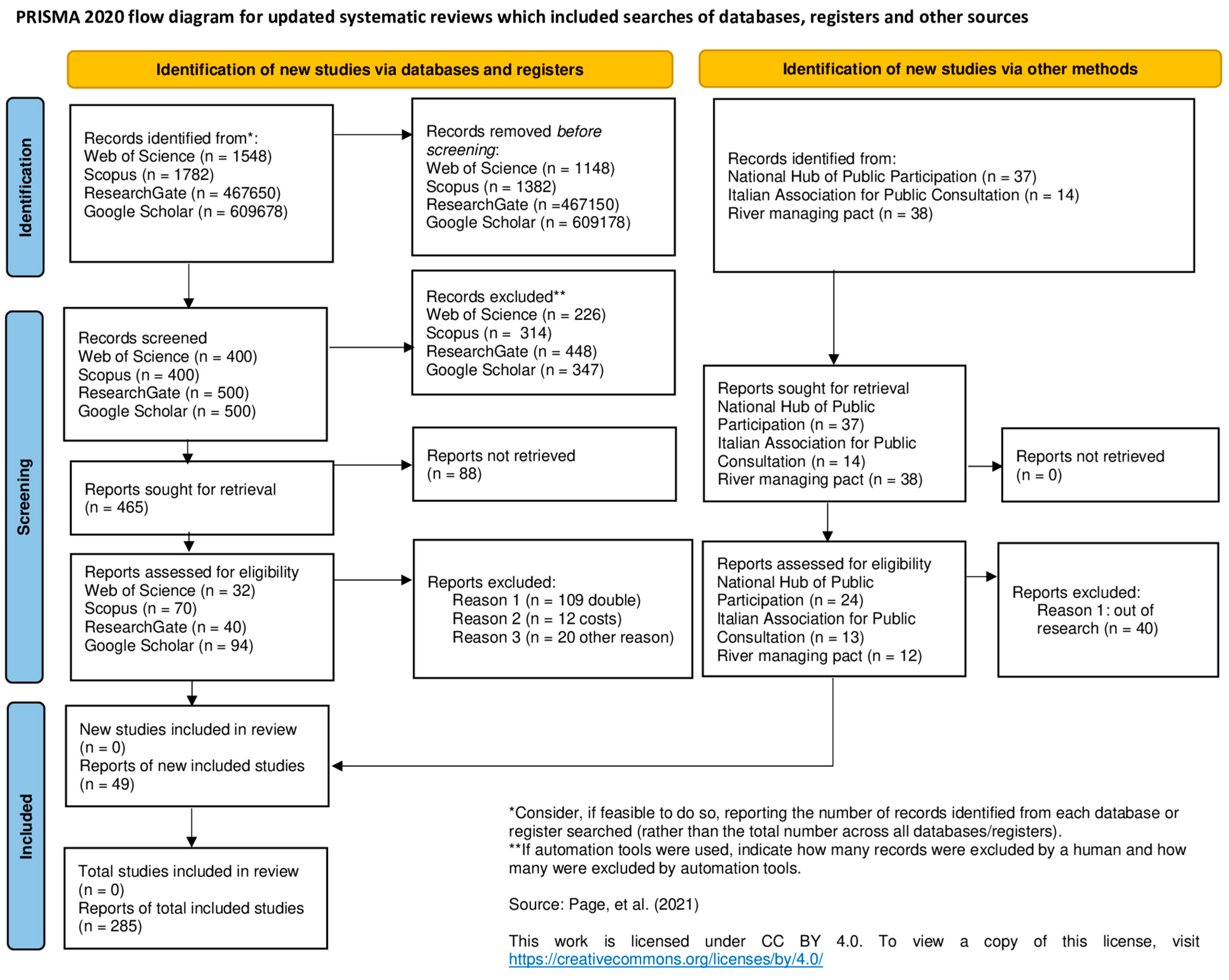 The inclusion phase involved an in-depth reading conducted by two independent reviewers to verify alignment with the following dimensions of evidence quality: (i) design limitations, (ii) internal coherence, (iii) precision of reported outcomes, (iv) contextual fit with Italian governance, and (v) publication bias (e.g., project websites reporting only successes). Consistent with the scope of a PRISMA review, we did not carry out a formal risk-of-bias scoring or a detailed re-assessment of each study’s research design, sample representativeness, or statistical analysis. Peer-reviewed articles were assumed to have already undergone basic scientific scrutiny in their original publication venues. Our evidence-quality checks therefore served primarily to determine eligibility and to inform the narrative weighting of studies, rather than to rank or rate individual designs. Where disagreement arose, discussion led to a final decision, which was systematically logged in a continually updated and shared database. Where applicable, researchers provided justifications for downgrading or upgrading the certainty of the evidence, clearly documenting their reasoning in footnotes and annotations. This rigorous peer assessment process enhanced the scientific reliability and robustness of the review outcomes. After this refinements, 94 studies from Google Scholar, 70 from Scopus, 40 from ResearchGate, and 32 from Web of Science, were assessed for eligibility. From the grey literature, 24 participatory cases from National Hub of Public Participation, 13 from the Italian Association for Public Consultation, and 12 from River Contracts were also included in the eligibility check. Altogether, 285 documents (including both academic and grey literature sources) passed the full eligibility check and were included in the final analysis. The final pool of included documents represented a balance of international academic literature and nationally grounded examples. A full bibliographic list is available in the