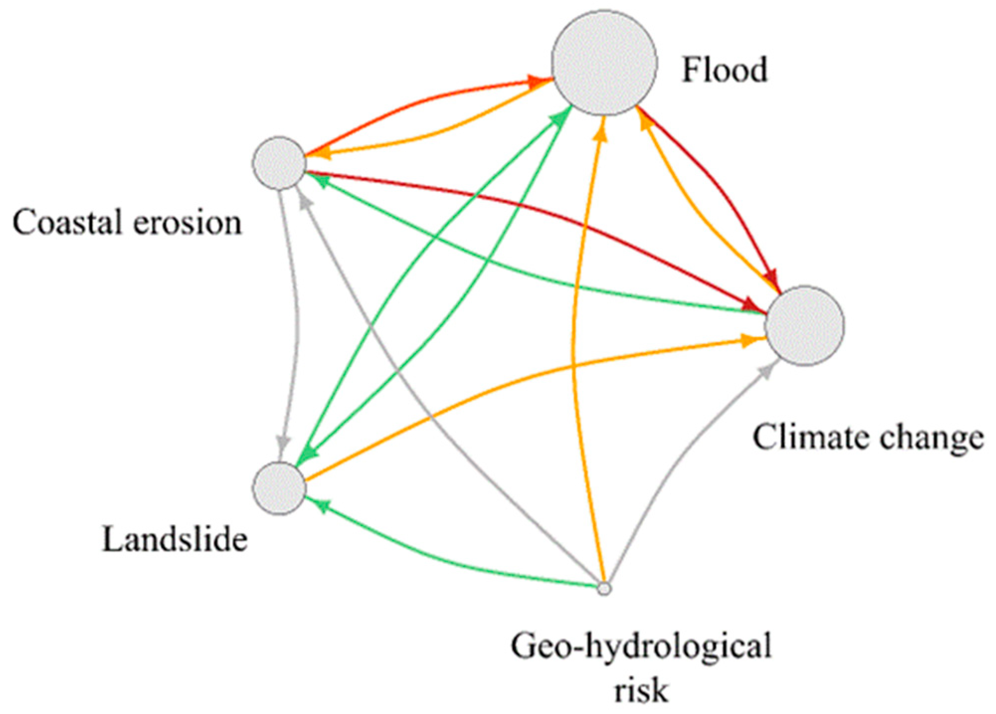 Figure 2 renders these interconnections graphically: red arrows denote the prolific co-occurrence of the climate change keyword in more than 20 articles covering the topics of flood and coastal erosion, while orange, yellow, green, and grey lines indicate progressively weaker overlaps (respectively, 15–20, 10–15, 5–10, and less than 5 articles). This clustering pattern thus confirms the high degree of thematic integration in the literature, particularly between flood risk and climate change and between coastal erosion and climate change. However, it also highlights the relative scarcity of papers linking integrated geo-hydrological perspectives to climate change. The peripheral position of multi-hazard thinking suggests conceptual silos that future research would do well to breach.