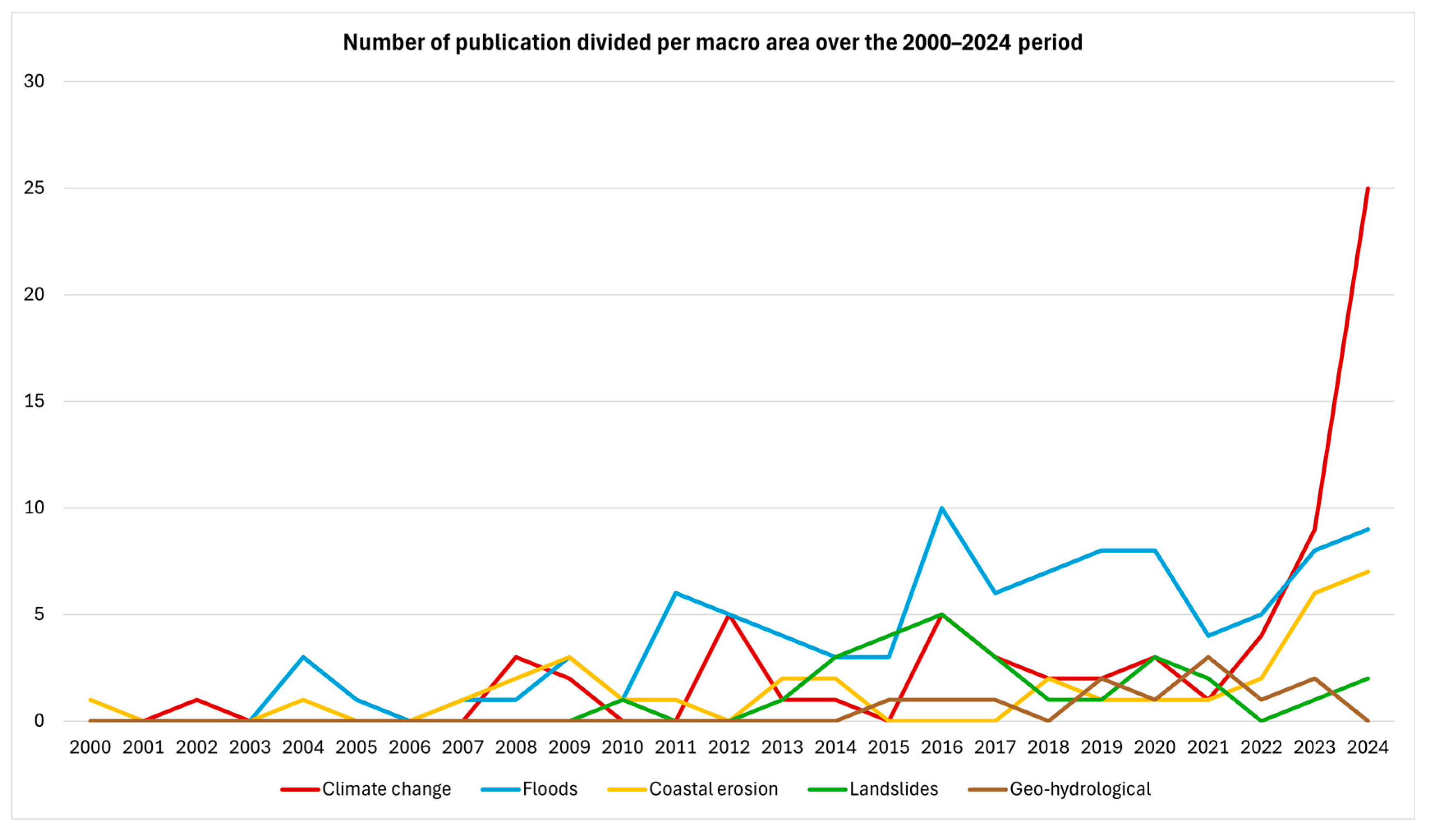 The academic component of the review was organised around the five-hazard domain introduced in the methodological section: floods, landslides, coastal erosion, geo-hydrological risk and climate change. Scholarly attention proved markedly uneven: 41% of the papers (96) concentrated on floods (see