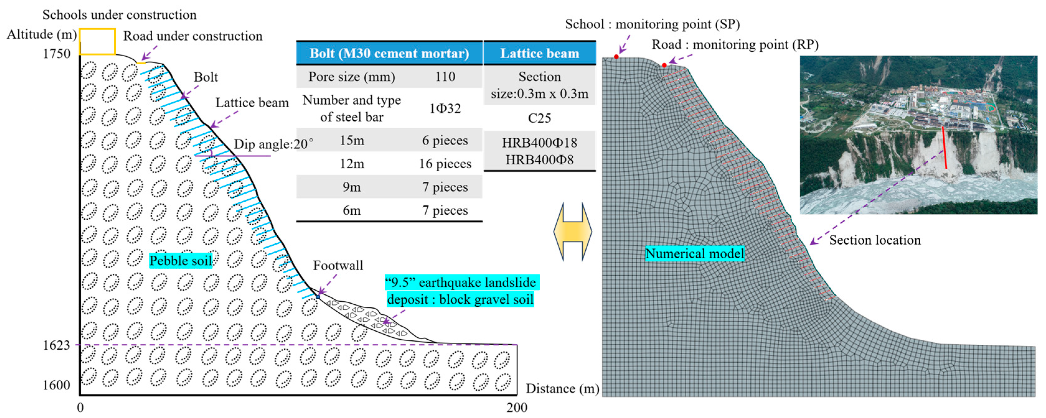 - With the increase in seismic intensity, the probability of instability and failure of the Caiyangba landslide also increases. Under the influence of ground motion, the effect of the “anchor lattice treatment method” on the improvement of the slope stability coefficient is limited. However, the improvement effect of slope stability increases with the increase in seismic intensity. Under the influence of ground motion, the variation in slope stability coefficient with time shows obvious fluctuation. The displacement of SP and RP shows obvious fluctuation with the development of ground motion duration, and its fluctuation law is similar to that of ground motion records. In the WMG condition, the large deformation position of the slope is mainly located at the midsection and toe of the slope. In the MG condition, the large deformation position of the slope is mainly located at the toe of the slope. Therefore, the displacement of the slope toe can be reduced by adding a gravity retaining wall at the slope toe. At the same time, it is also suggested that school buildings near the slope should reduce the load of the building on the foundation by reducing the number of floors, and the number of pile foundations should be increased to enhance the anti-settlement ability of the building. Roads should restrict the passage of heavier vehicles, such as cars. And the road should also be carefully stacked items to reduce the load of the road on the roadbed.