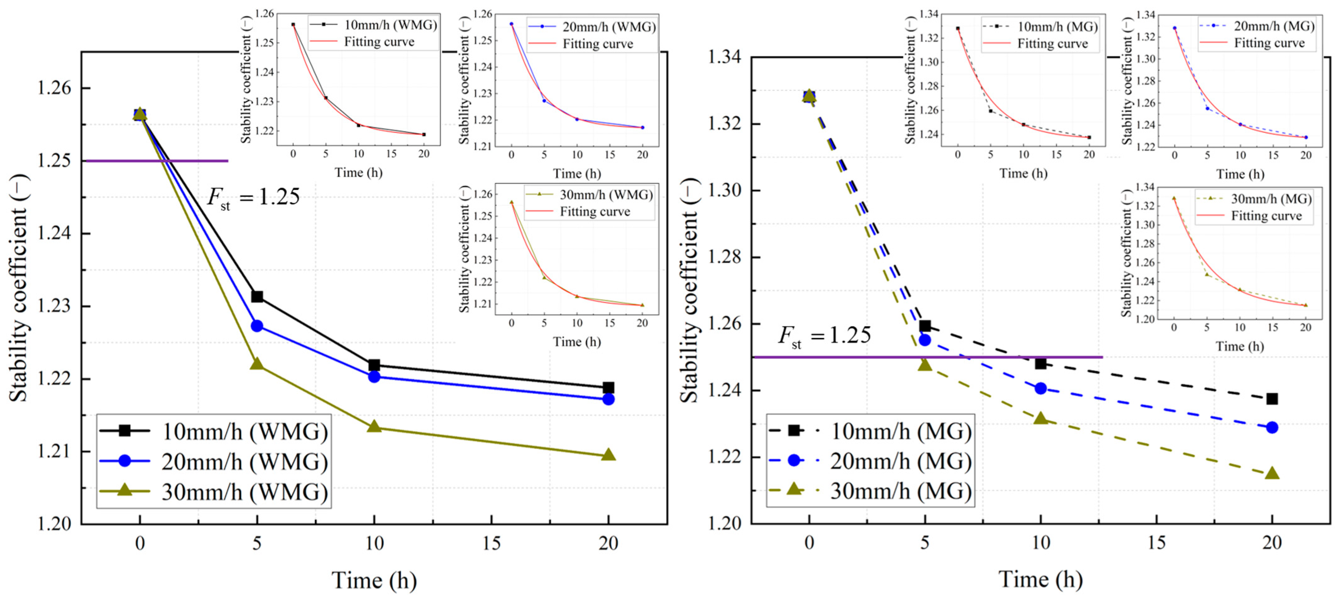 - The “anchor lattice treatment method” can effectively improve the stability of the Caiyangba landslide. The improvement effect of slope stability decreases with the increase in rainfall duration and the rainfall itself. Under the influence of rainfall, the development law of slope stability coefficient in WMG condition and MG condition with rainfall duration conforms to the development law of the exponential function (). At the same time, the expression () of the instantaneous change rate of the slope stability coefficient is derived. It is found that the slope stability coefficient will not always decrease under the influence of rainfall, but will gradually approach a limit value. When the curve of the slope is close to zero and tends to be stable, the dynamic development of the slope should be monitored to prevent the sudden instability of the slope.