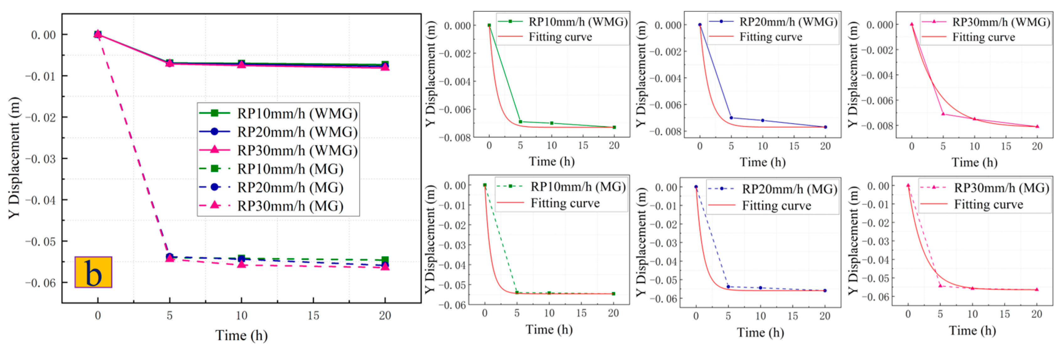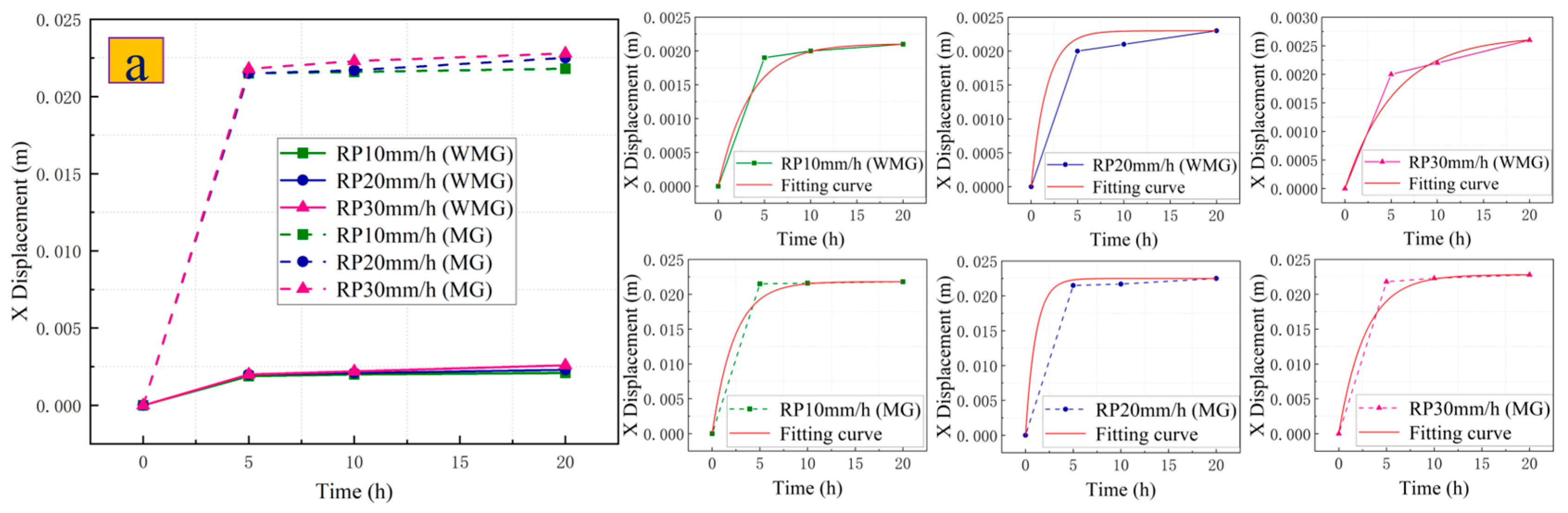 - After adopting the “anchor lattice treatment method”, the potential sliding surface of the Caiyangba landslide is reinforced, which greatly increases the integrity of the Caiyangba landslide, so that the X-direction displacement of the slope is mainly concentrated at the toe of the slope. At the same time, the extrusion phenomenon of the slope has also been greatly alleviated, so that the local uplift of the slope is mainly concentrated at the foot of the slope. Therefore, after adopting the “anchor lattice treatment method”, a gravity retaining wall should also be added to the slope toe to reduce the displacement deformation of the slope toe. And the development law of X-direction displacement and Y-direction displacement of SP and RP conforms to the development law of the exponential function (). The development law of the instantaneous change rate of the SP and RP displacements also conforms to the development law of the expression (). And after adopting the “anchor lattice treatment method”, the Caiyangba landslide can withstand greater displacement deformation and increase the usability of the slope.