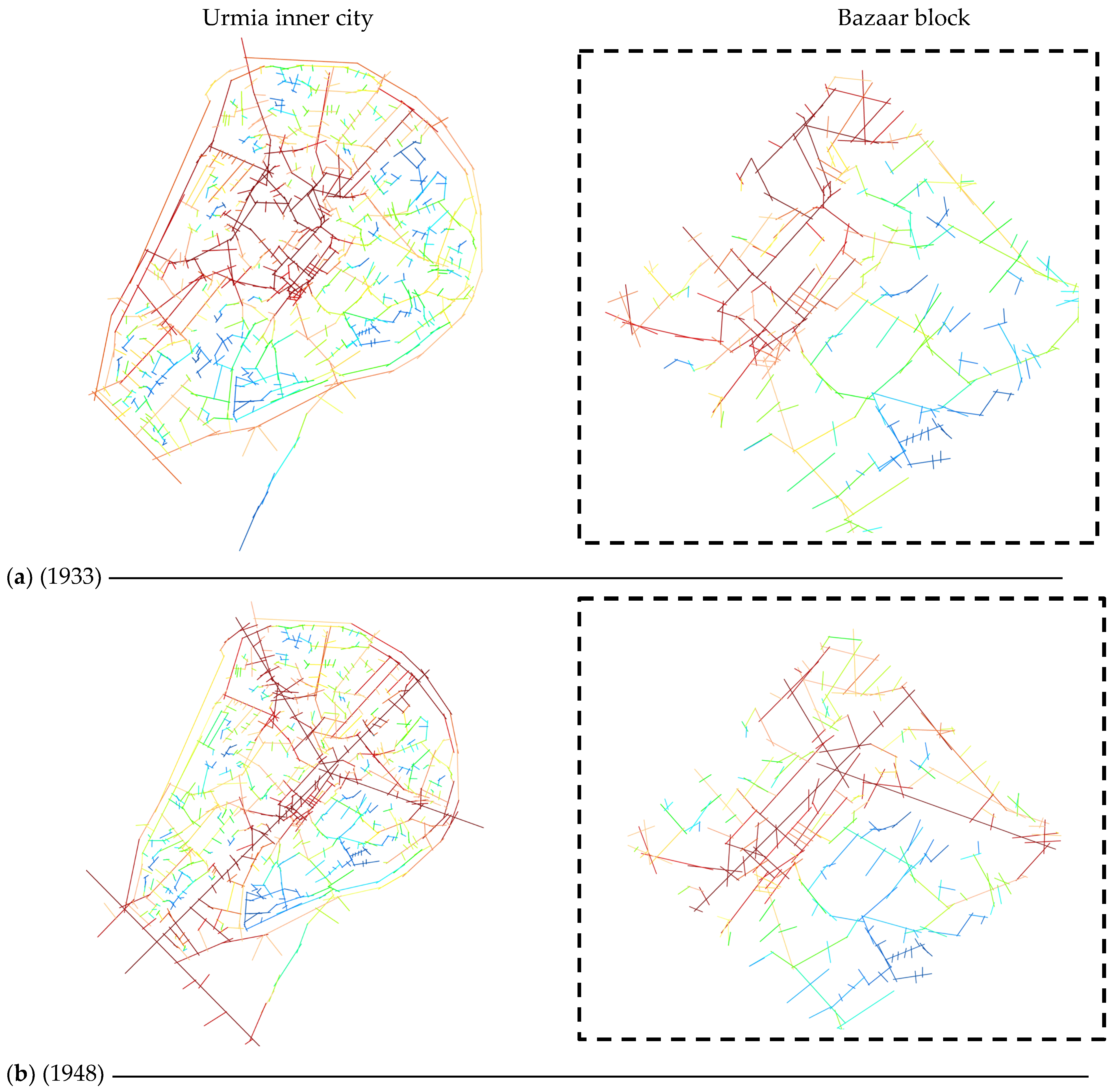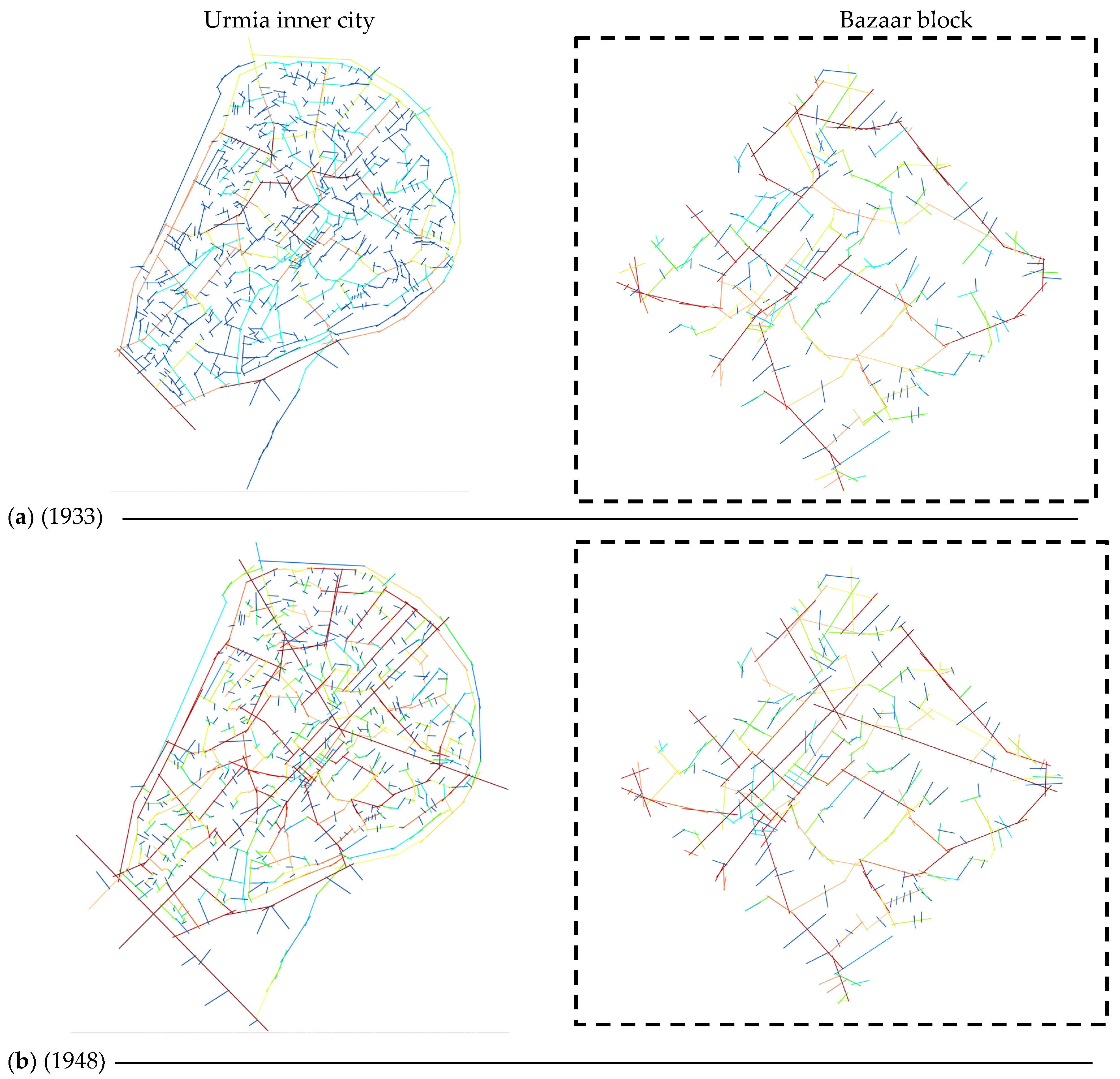 - To analyze the spatial transformation of Urmia between 1933 and 2018 using key Space Syntax indicators, and to assess the impact of the transition from organic to grid-based urban patterns on spatial accessibility;