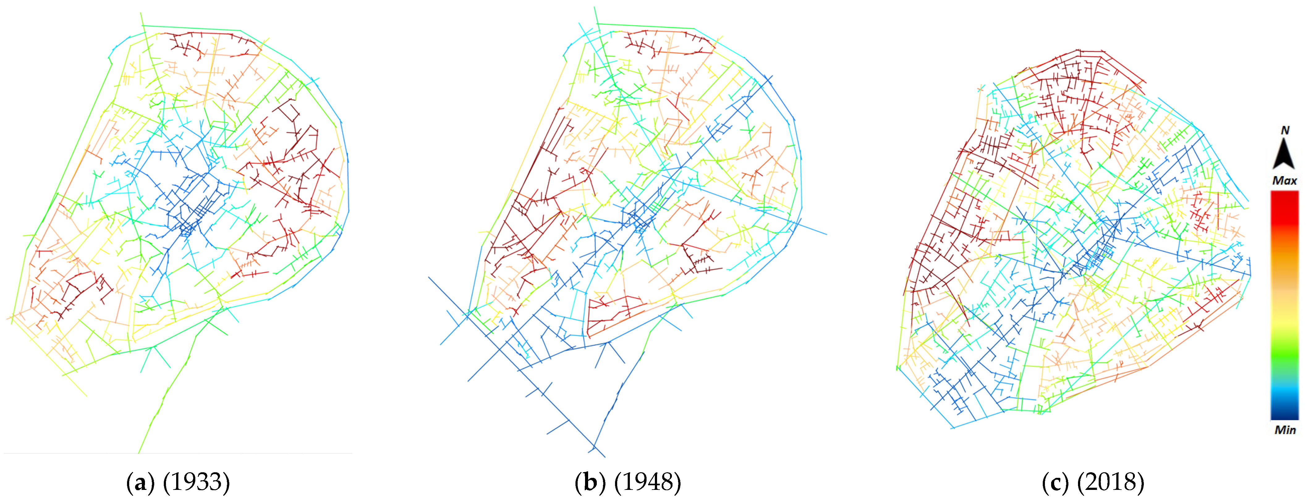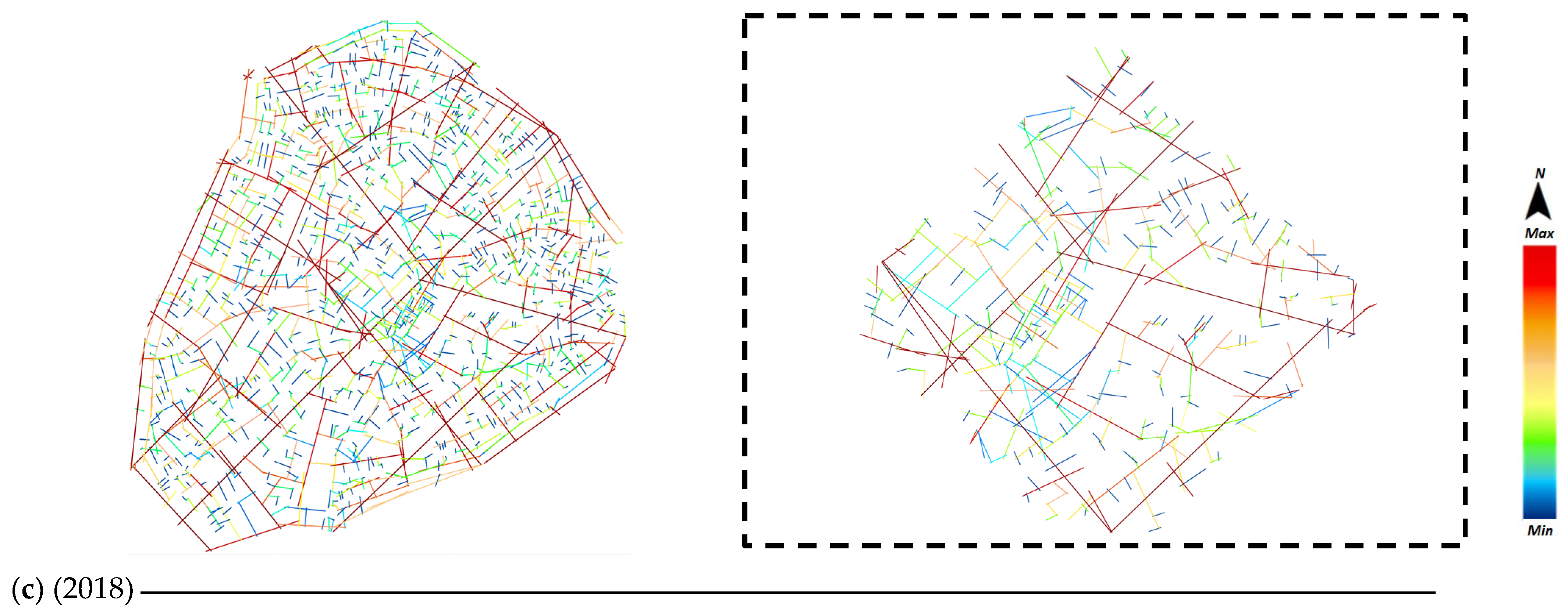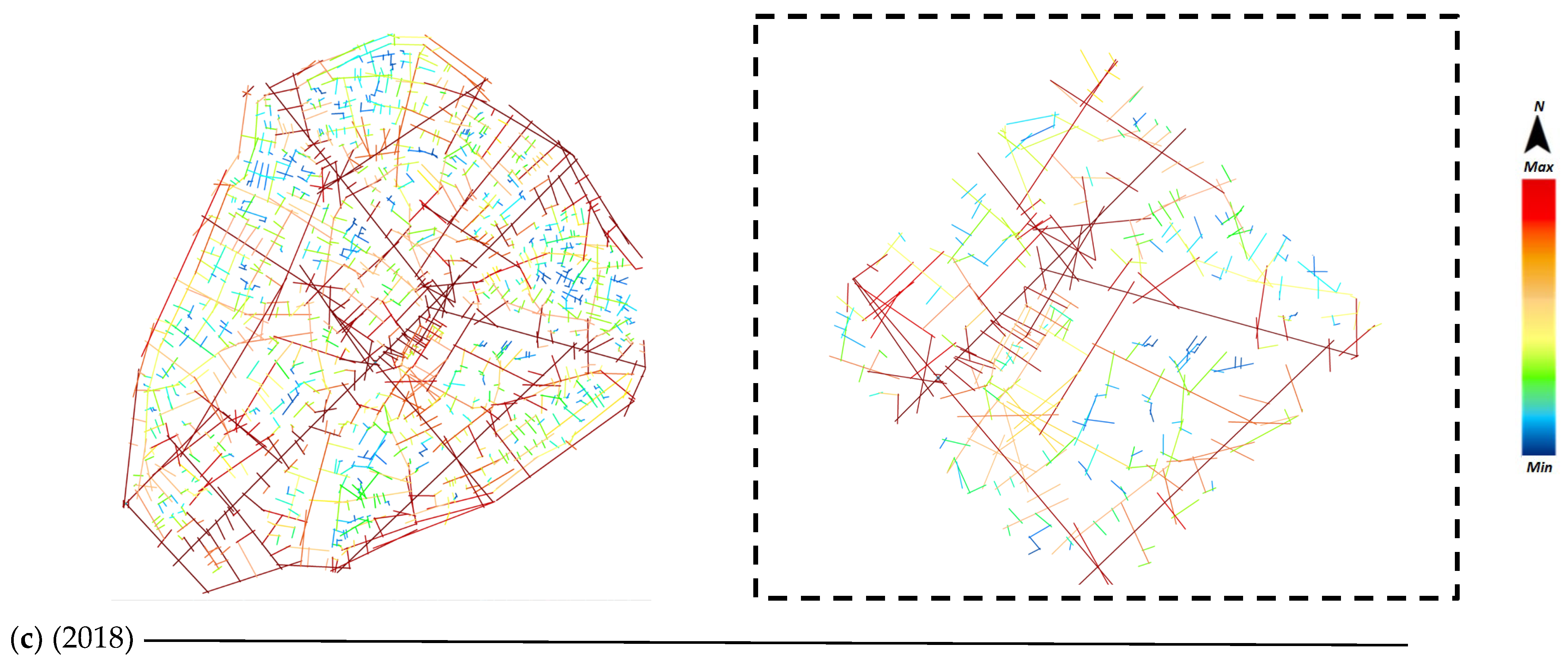 - Increased Mobility and Connectivity: Global measures of Topological analysis of NAC and NAI, which reflect user-friendliness and the possibility of pedestrians choosing certain paths, have increased over time. This indicates the growing importance and increased use of the city center’s spaces.
