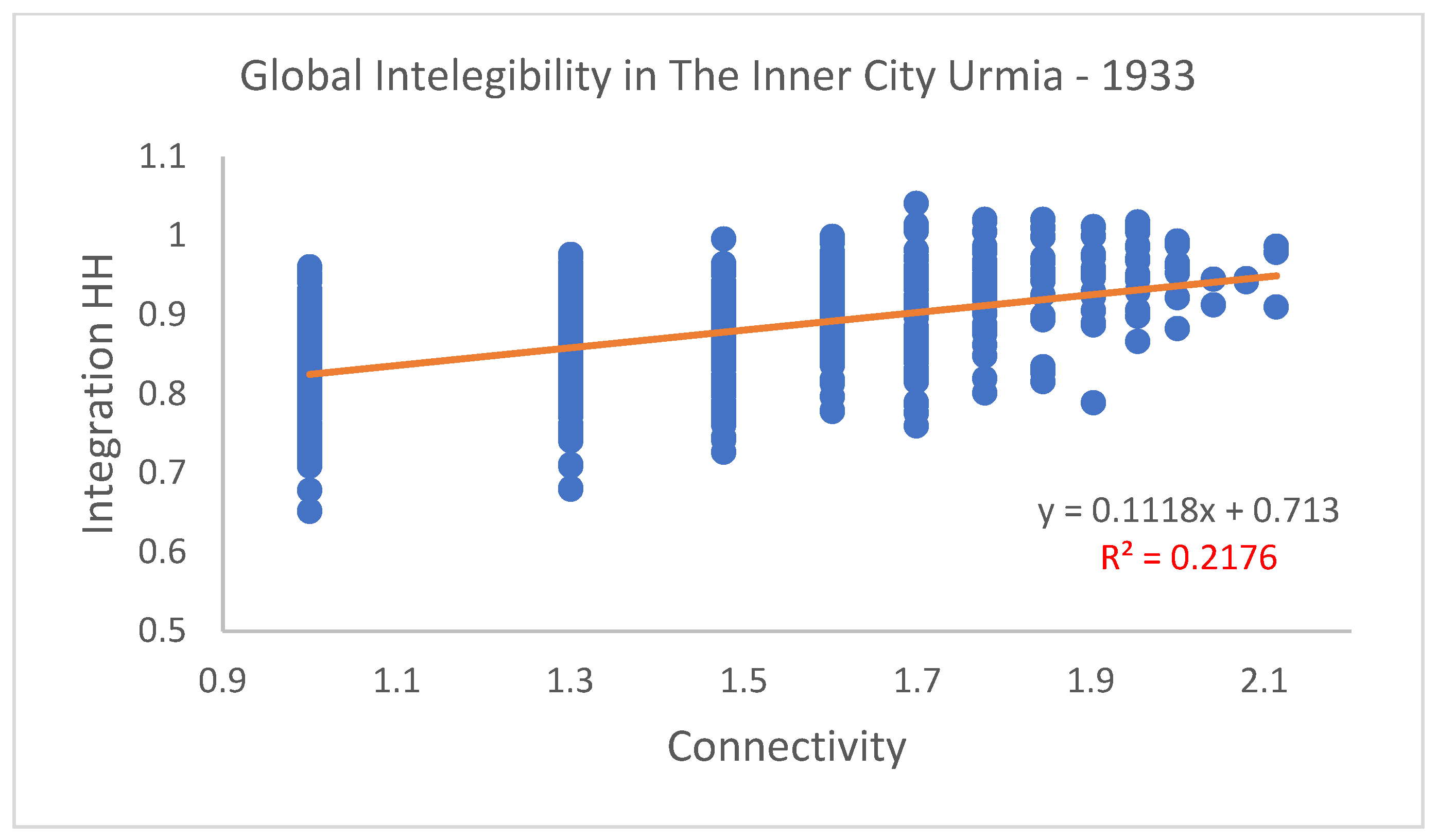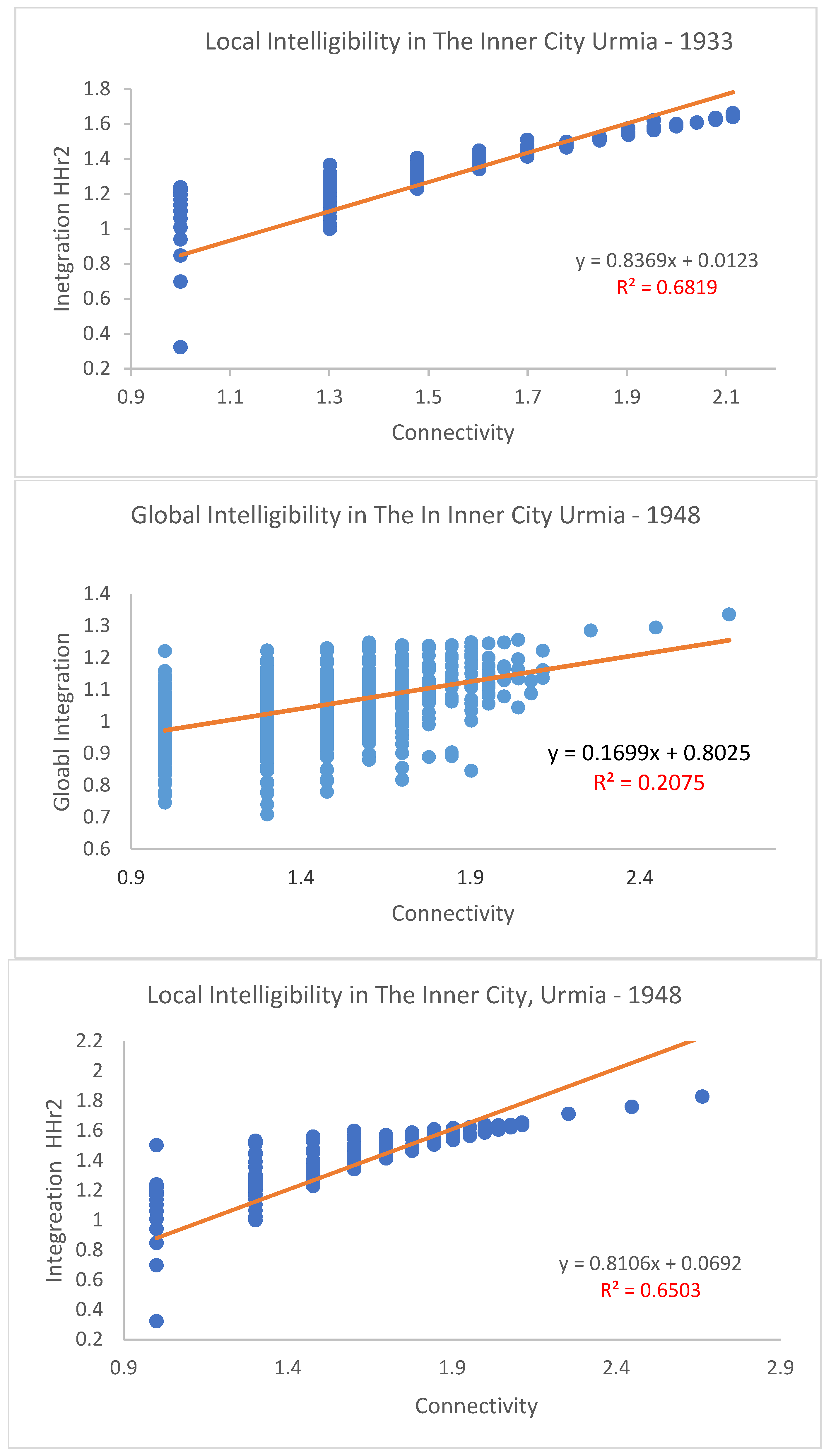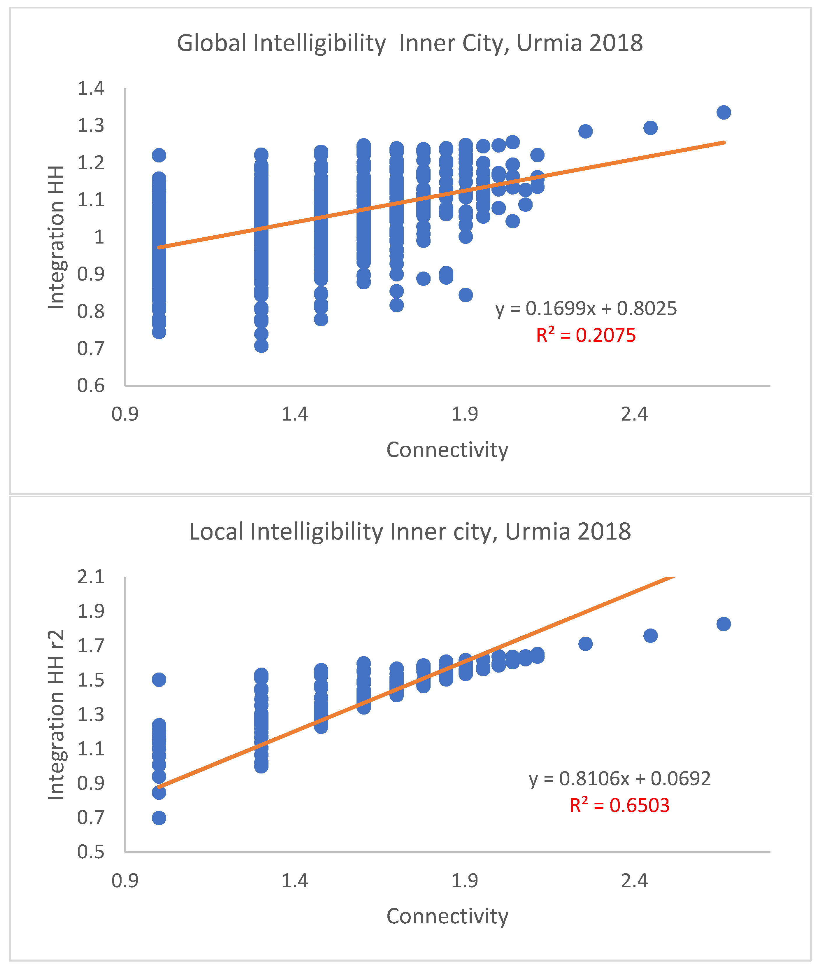 - The meaning of ‘Intelligibility’ as a measure expressing the relationship between local and global integration (R2), reflecting the legibility and perceptual coherence of the urban form. It indicates how easily the overall spatial layout of a city can be understood from its local structure. Higher R2 values represent a more legible and cognitively understandable network, whereas lower values indicate spatial fragmentation and difficulty in wayfinding [35,53].