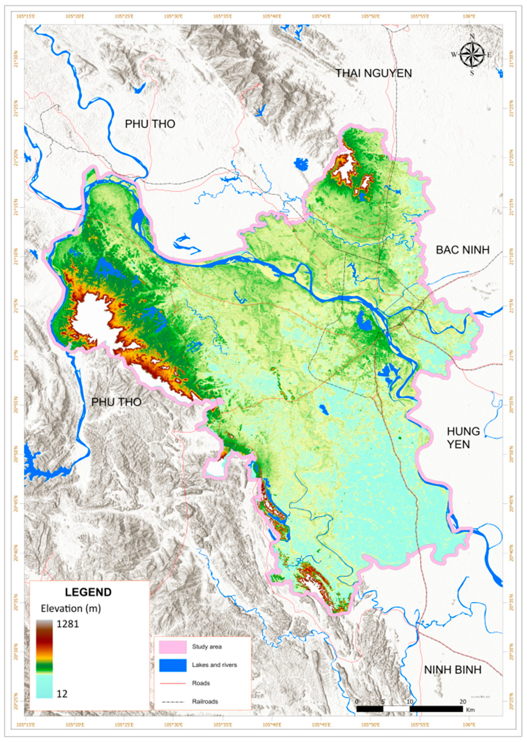 - Hanoi General Basic Investigation Steering Committee; Dao, D.B. Atlas of Hanoi Capital (Geomorphology Map); Dalat Publishing House: Dalat, Vietnam, 1984. (In Vietnamese) [Google Scholar]