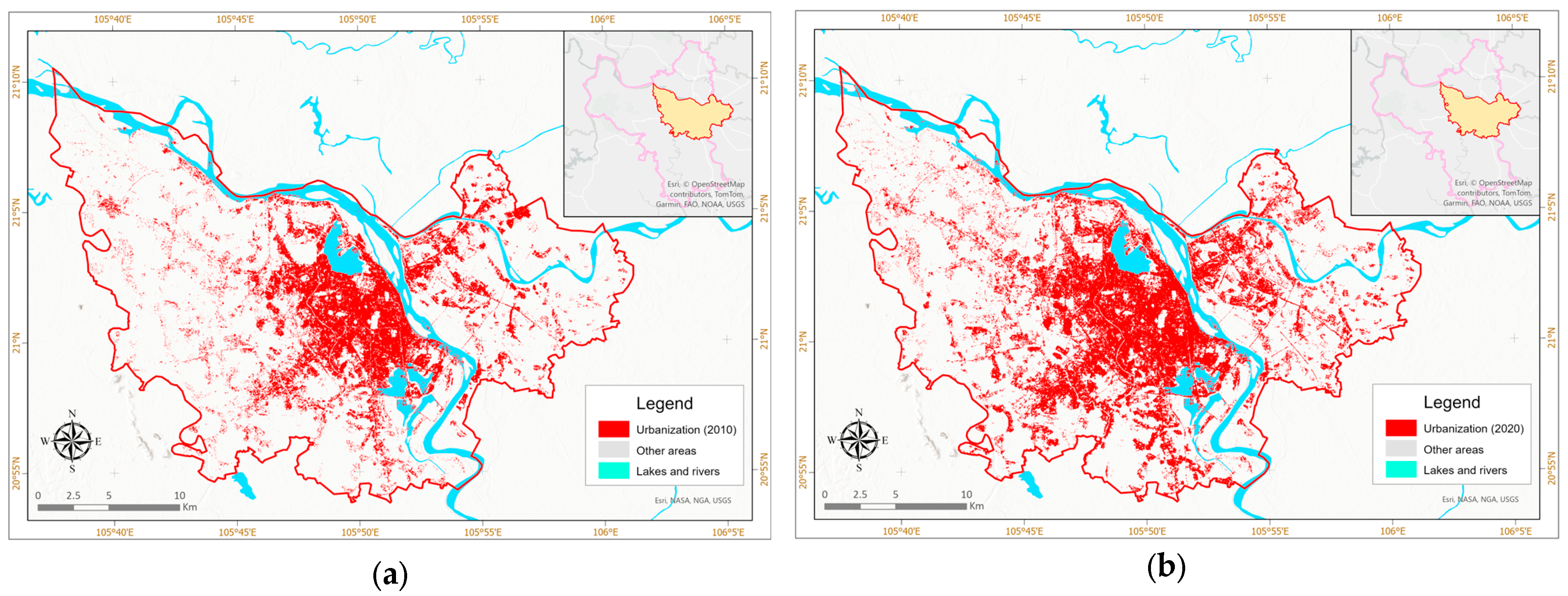 4.2. Urbanization Trends on Geomorphological Units in Hanoi