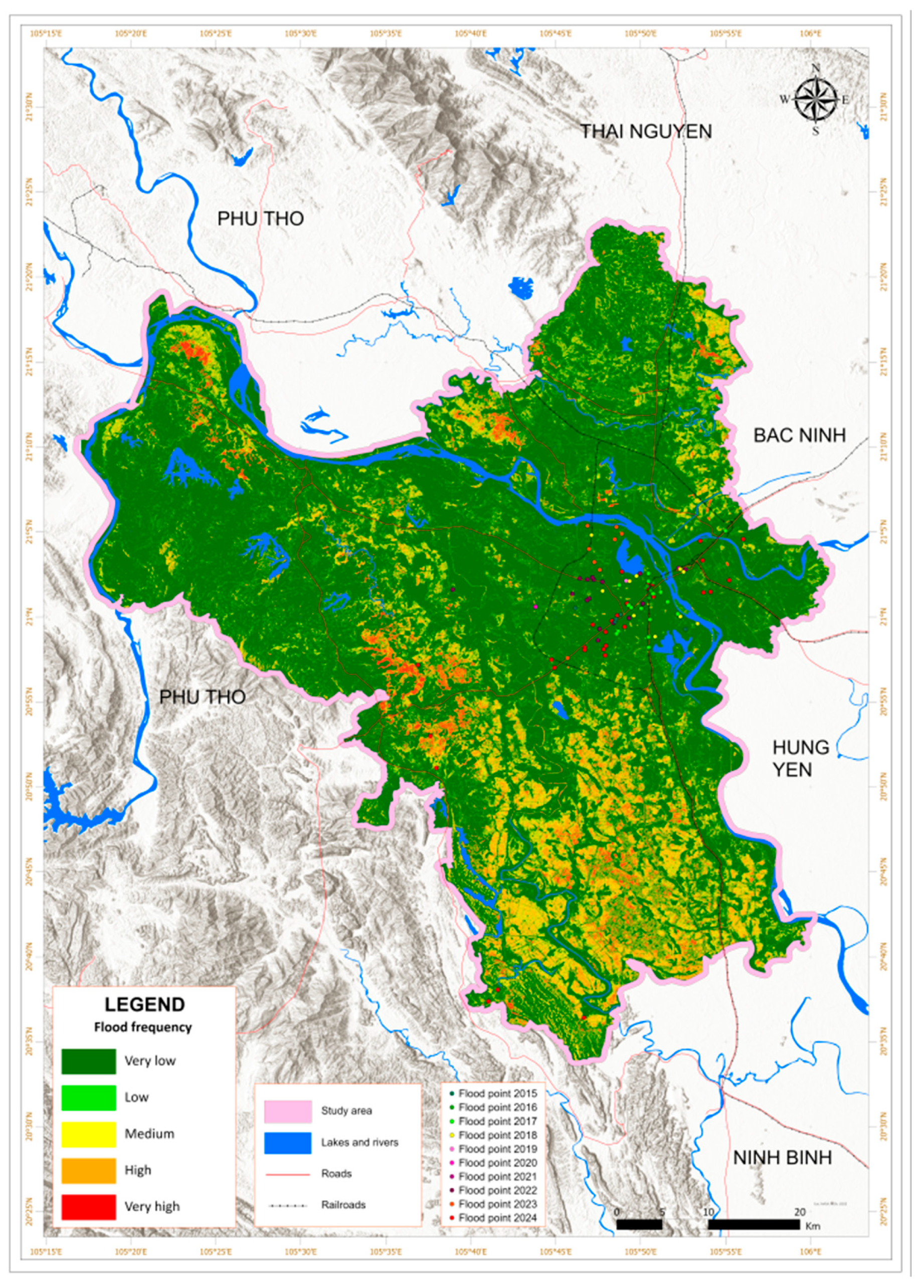 - Validation: Using 148 historical flood points (2012–2024) collected from official reports, media sources, and GPS surveys for spatial–temporal matching. The validation focused on flood occurrence and distribution rather than flood depth or duration, due to the limited resolution of reference data.