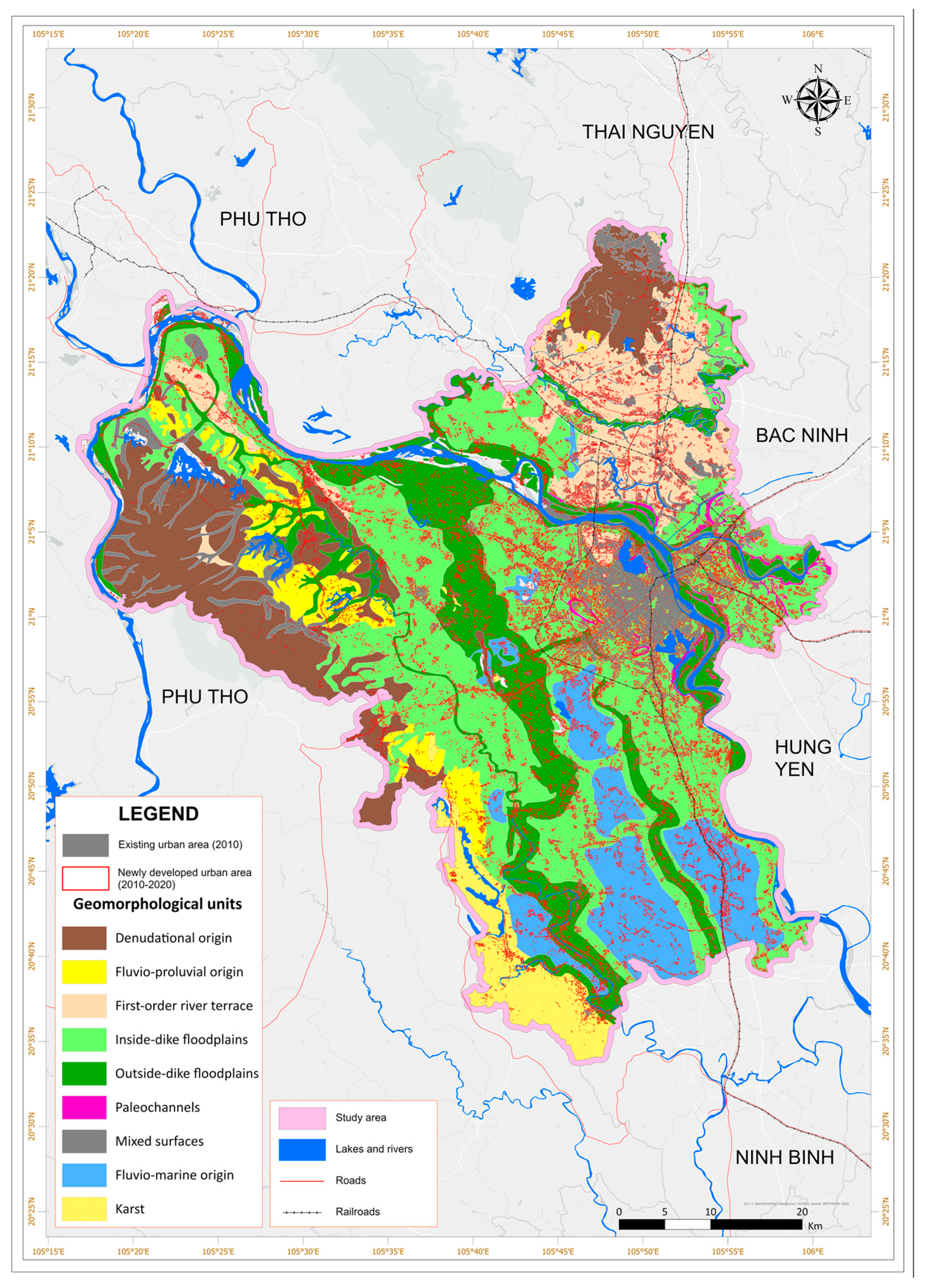 - Bao, D.V.; Bac, D.D.; Hieu, N.; Bac, D.K. Geomorphological Research for Planning the Western Expansion of Hanoi City. In Proceedings of the 10th Southeast Asian Geography Conference; Hanoi National University of Education Publishing House: Hanoi, Vietnam, 2010; pp. 132–139. (In Vietnamese). [Google Scholar]