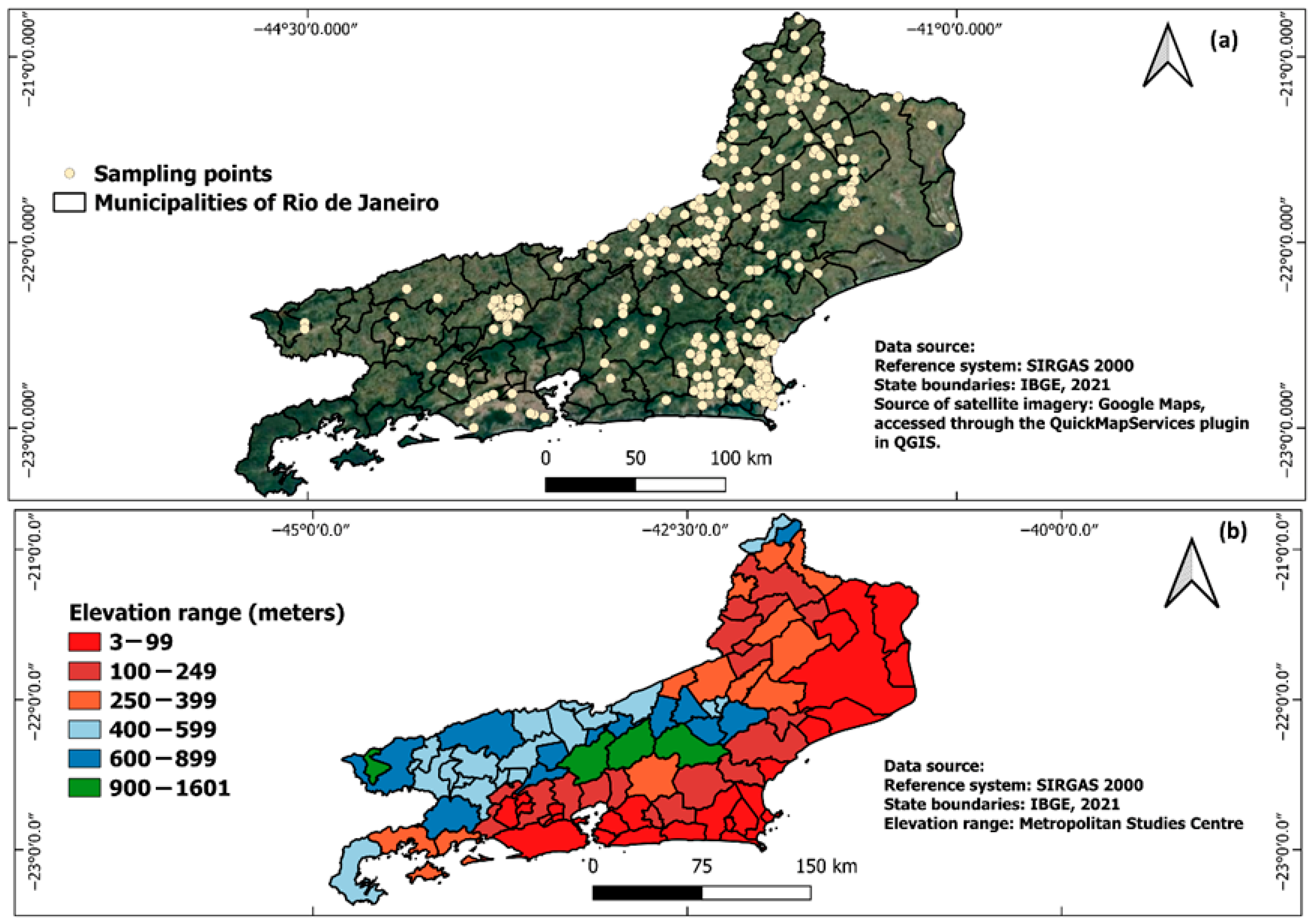 | Altimetric map | Digital model representing the altitudes of the topographic surface aggregated to the existing geographical elements on it. Data downloaded in vector format with a scale of 1:250,000. | IBGE | https://www.ibge.gov.br/geociencias/modelos-digitais-de-superficie/modelos-digitais-de-superficie/10856-mde-modelo-digital-de-elevacao.html?=&t=o-que-e (accessed on 9 May 2025) |