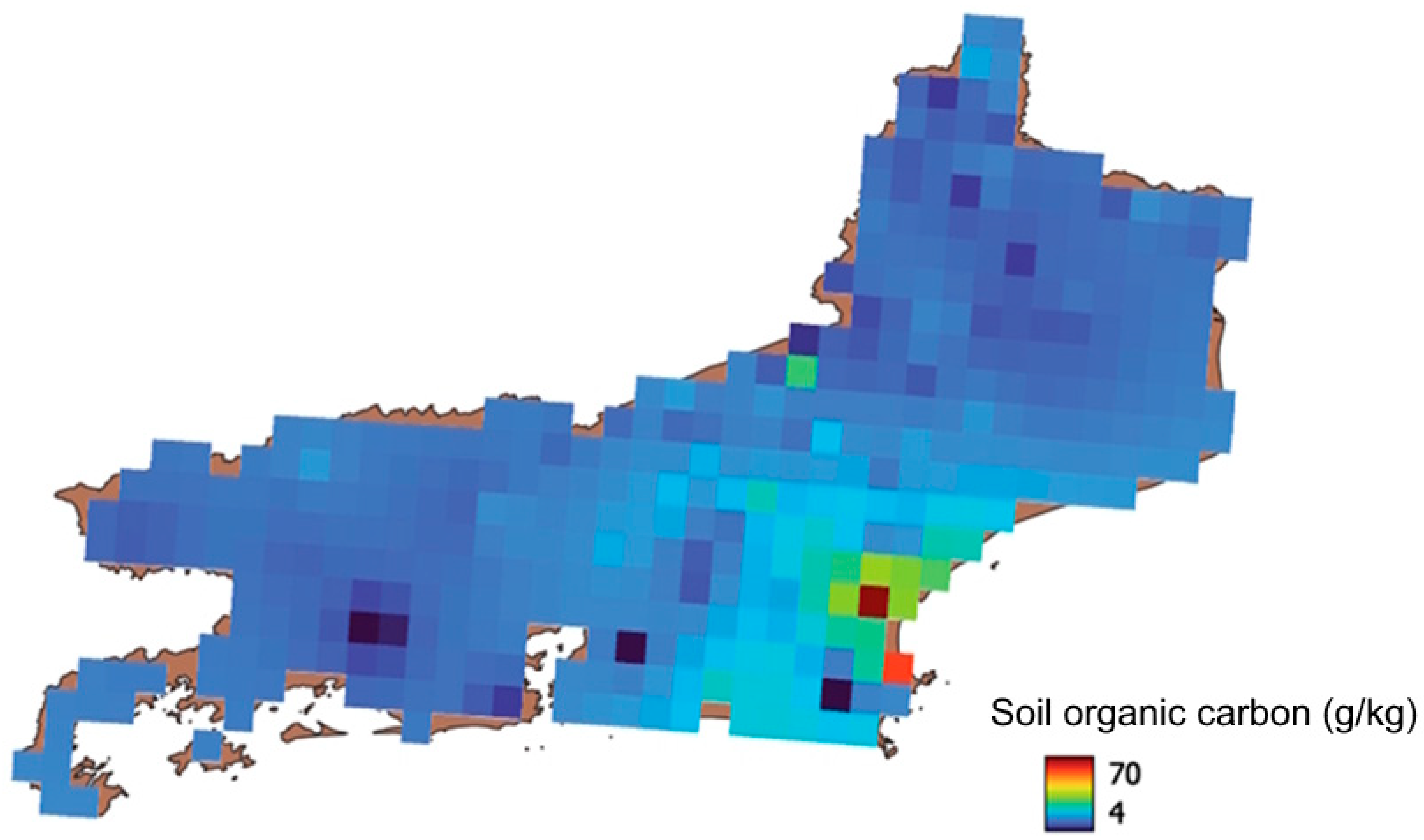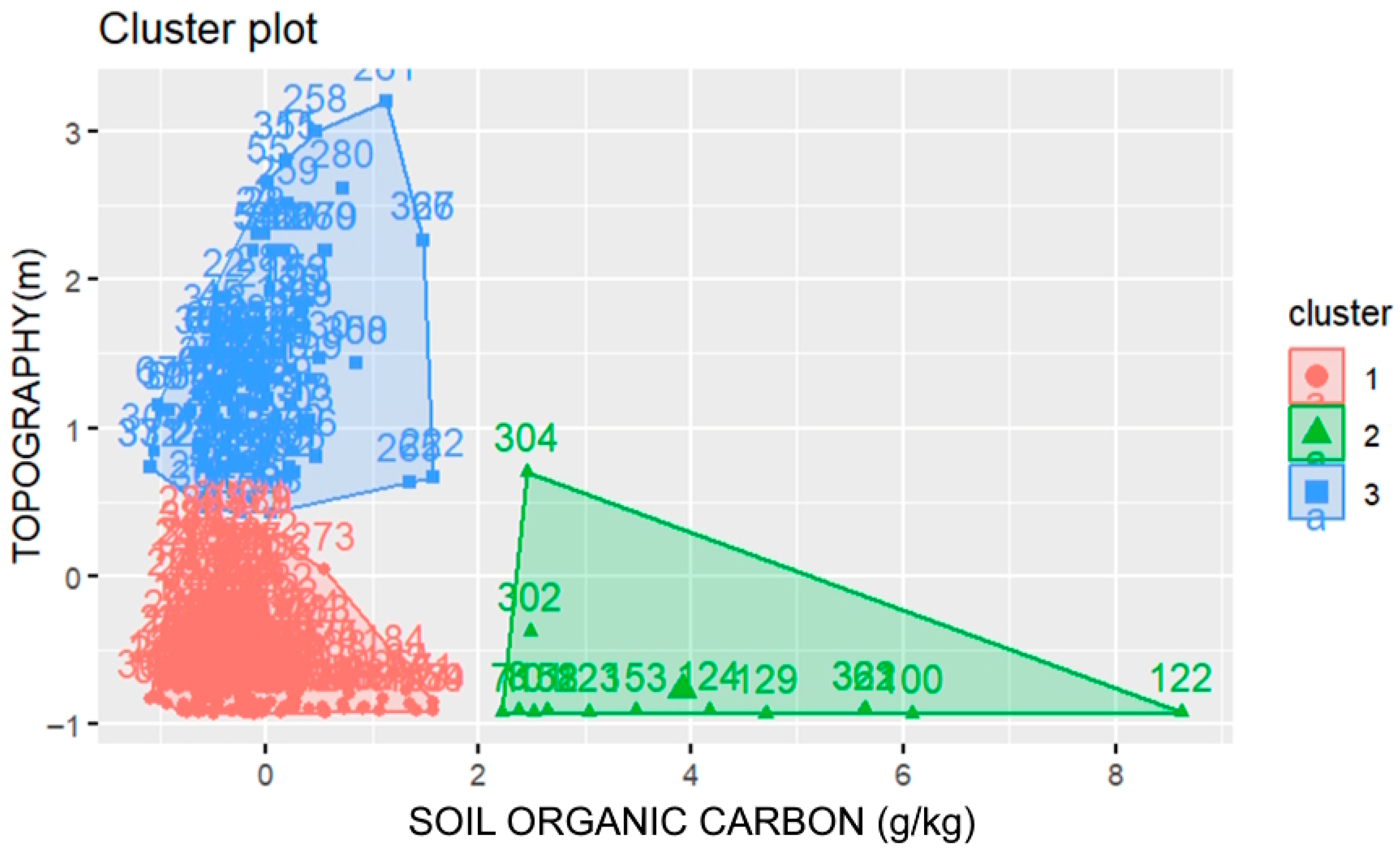- Cluster 3 (blue): This cluster comprises samples from areas of higher elevation, where SOC values range from low to moderate.