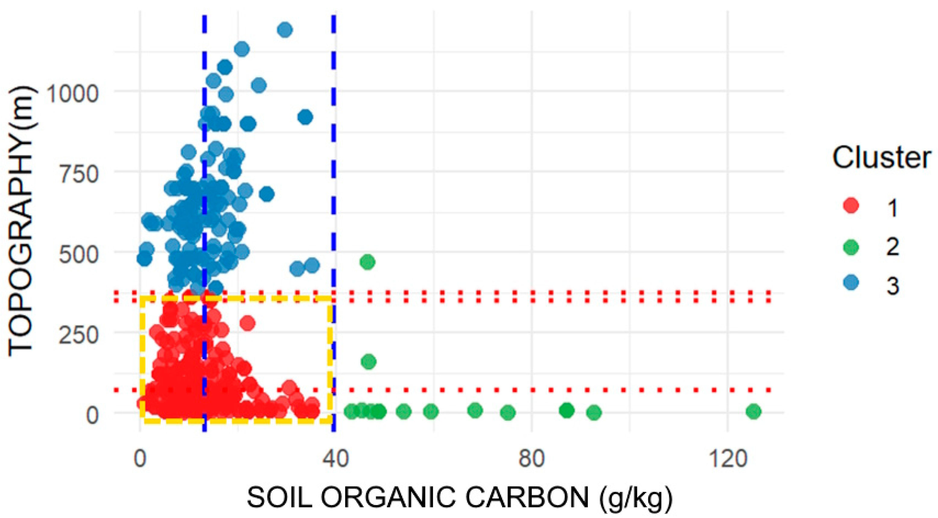 - Cluster 1 (red): This group primarily includes points located in areas with low to moderate elevation, characterized by low to moderate SOC values.