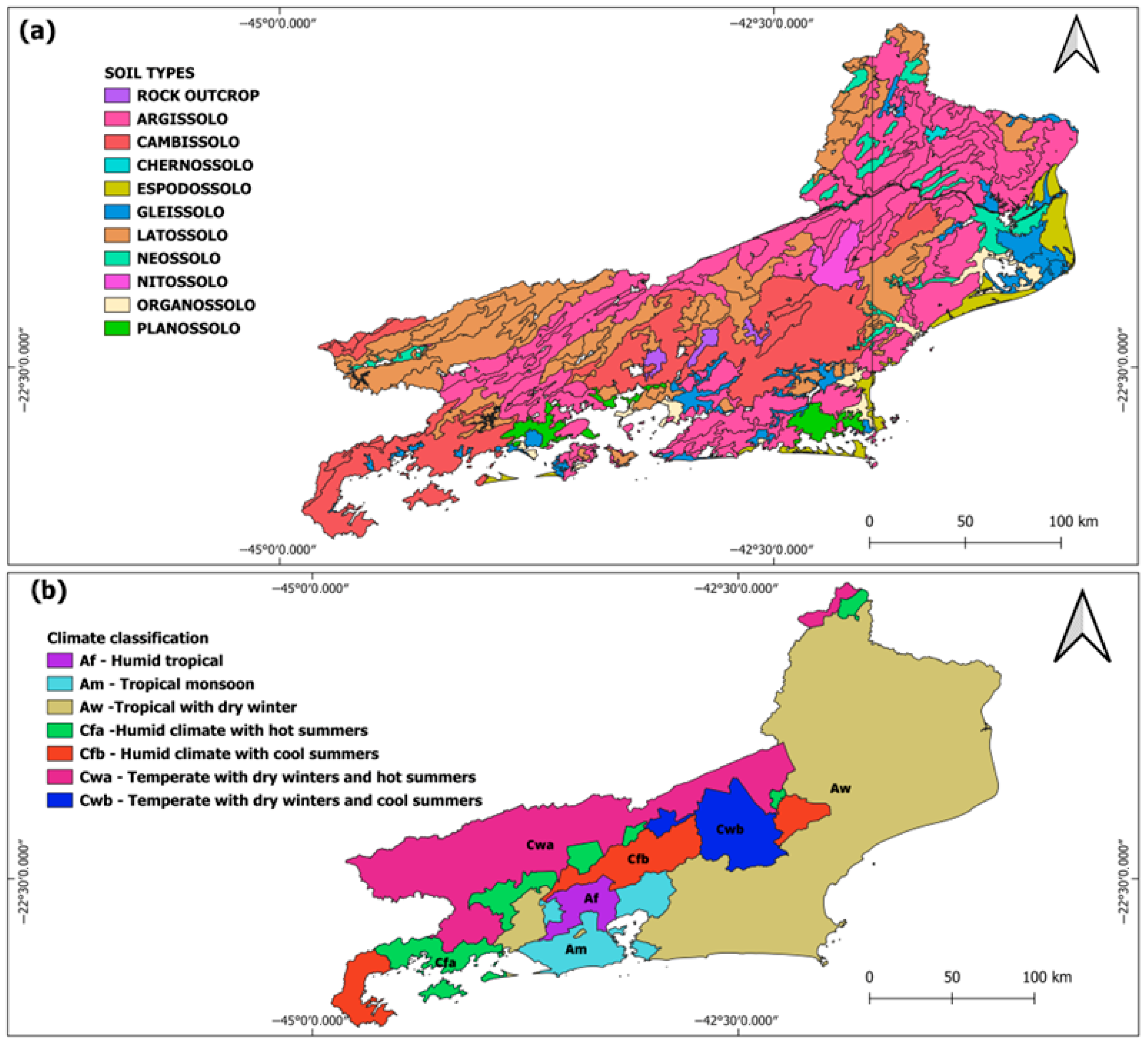 | Soil types | Soil mapping of Brazil (Scale 1:250,000) | IBGE | https://www.ibge.gov.br/geociencias/informacoes-ambientais/pedologia/10871-pedologia.html?t=downloads (accessed on 9 March 2025) |