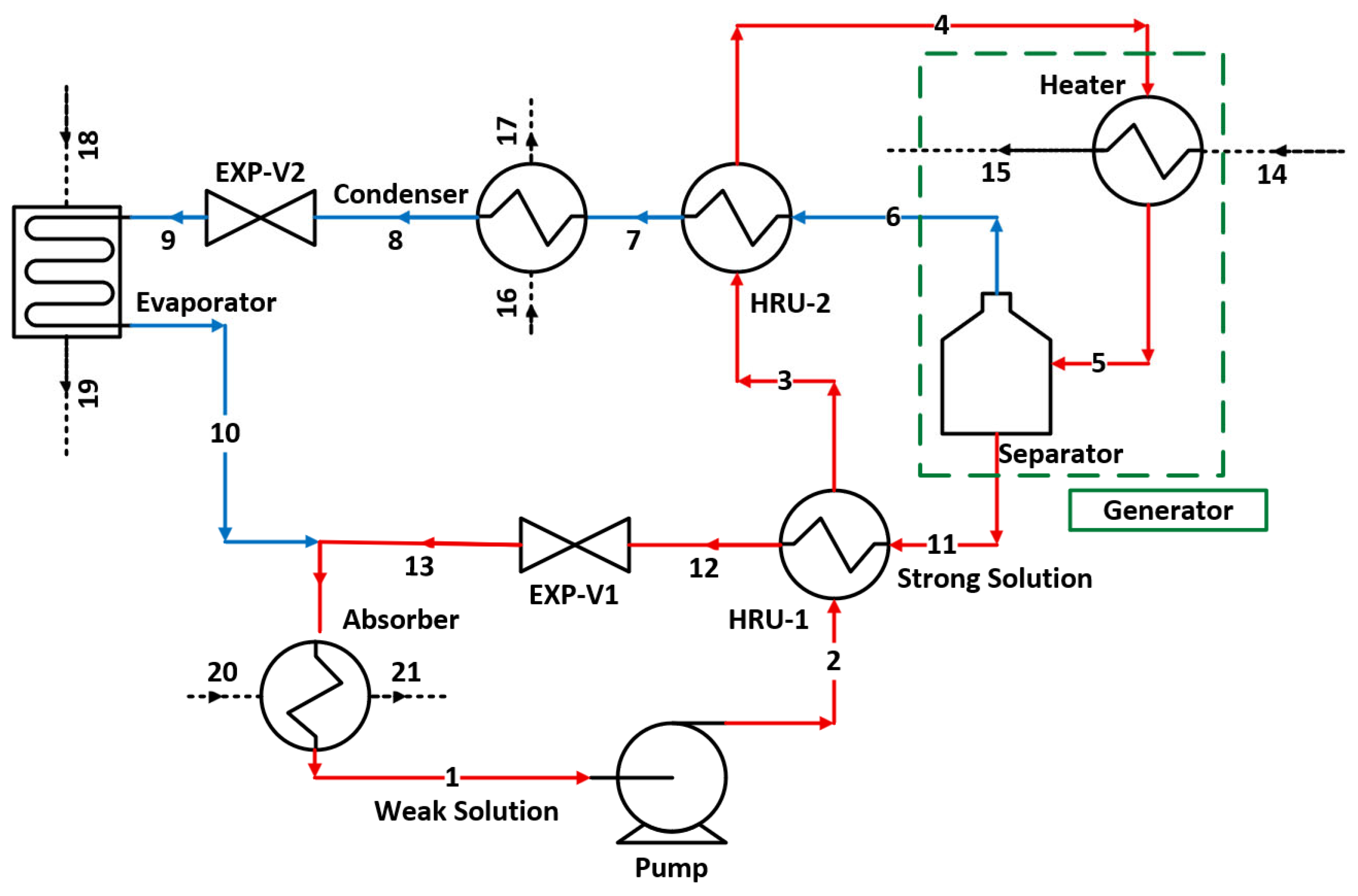 The weak solution of LiBr–H2O is pressurized to a desired level by a pump from state 1 to state 2. To reduce the amount of heating needed to operate the cycle, which ultimately improves the overall thermal efficiency of the cycle, there are two heat recovery units (HRUs) installed. HRU-1 recovers the heat from the hot, strong solution (i.e., concentrated) of LiBr–H2O coming from the separator (state 11). Stream 2, coming out of HRU-1 (state 3), enters HRU-2, where it exchanges heat with the hot water vapour leaving the Separator before entering the generator. The generator is a component that includes a heater and a separator. The weak solution is heated to a desired temperature in the heater, and then it enters the separator, where the water vapour is removed from the solution, increasing the concentration of LiBr in the solution; thus, it is called a strong solution. The strong solution leaves the separator and exchanges heat with the weak solution in HRU-1; it then passes through a throttling valve (EXP-V1) before absorbing the low-pressure water vapours from the evaporator.