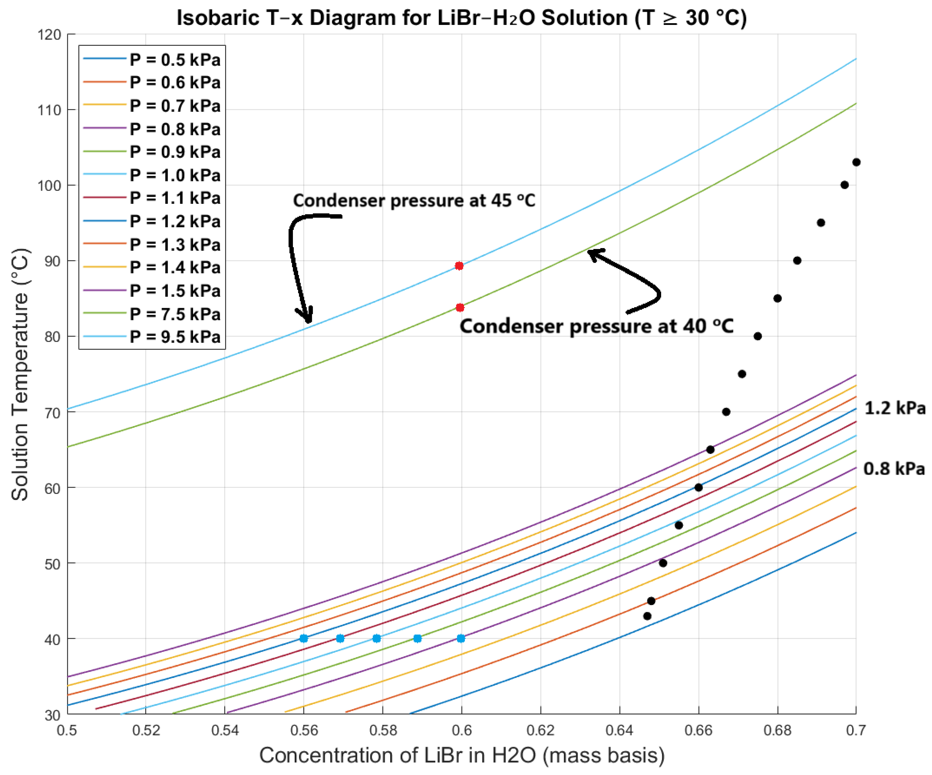Figure 3 also provides important insights into the minimum operating temperature of the generator for a given weak solution concentration and condenser pressure. For example, if the weak solution concentration is 0.6, the generator must operate above approximately 83 °C and 89 °C for condenser pressures of 7.5 kPa and 9.5 kPa, respectively (refer to the red dots in