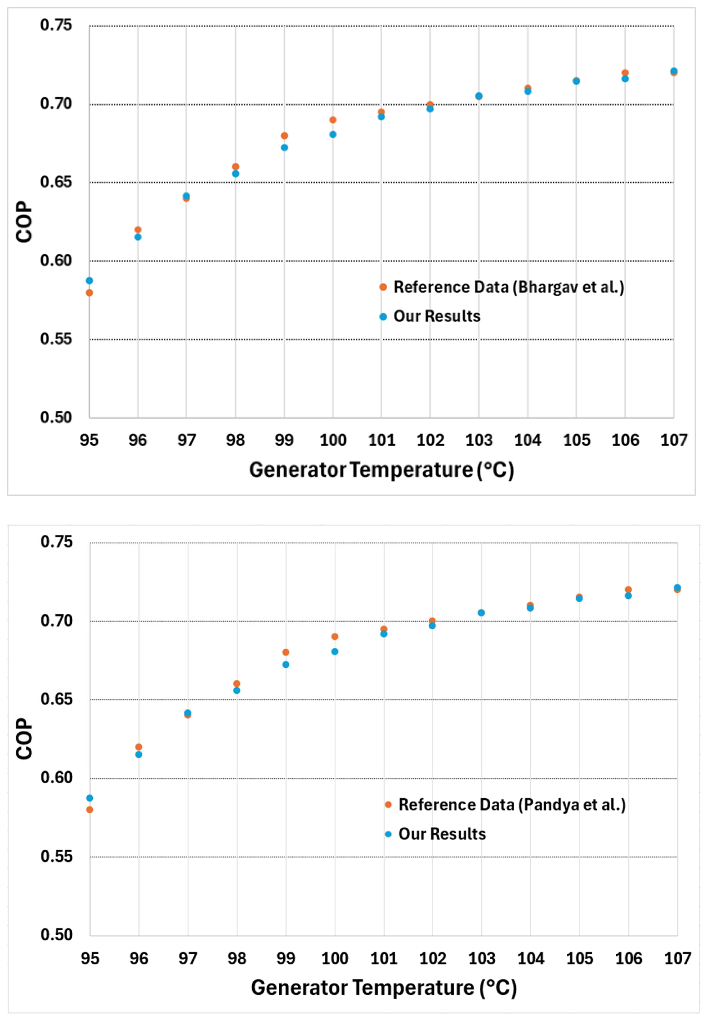 Figure 4 presents the COP plotted for a generator temperature range of 95 to 107 °C along with the COP obtained from reference [