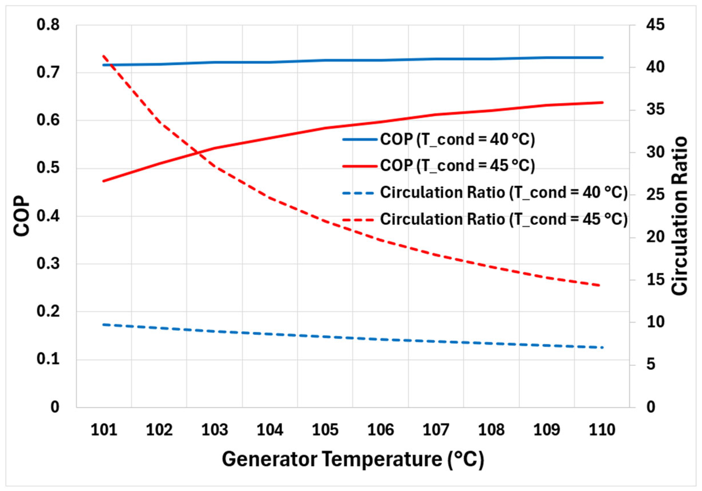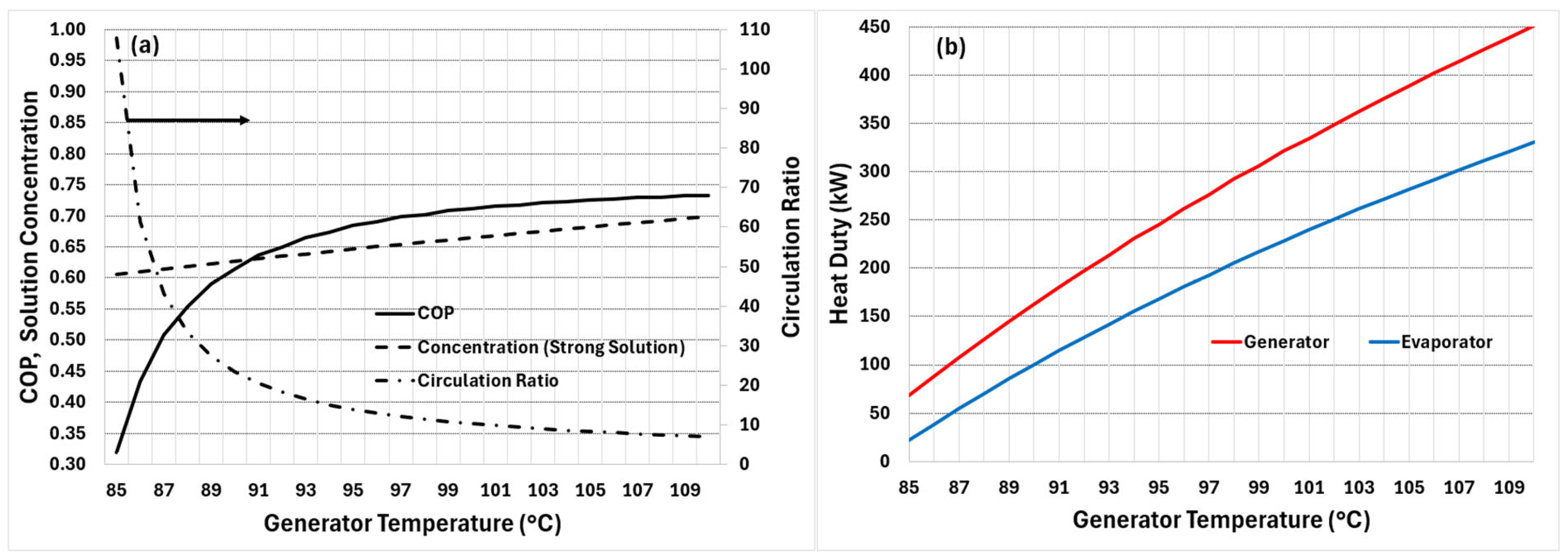 Figure 2). The results are obtained for a fixed evaporator pressure of 0.8 kPa (corresponding to evaporator temperature of 4 °C) and condenser/absorber temperatures of 40 °C. The weak solution concentration is fixed at 0.6, which corresponds to the minimum allowable at an absorber temperature of 40 °C.
