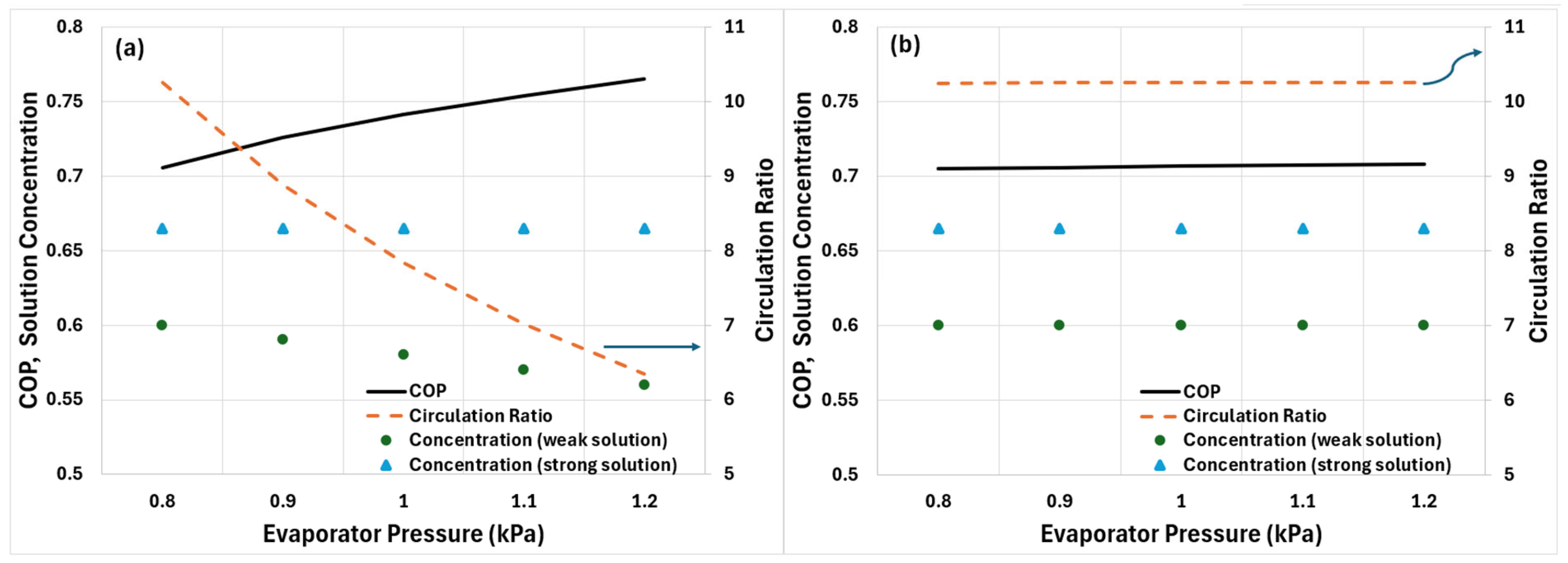 Figure 7a,b shows that if the concentration of the solution at the pump inlet is at its minimum allowable value (that avoids vapours at the pump inlet) makes the cycle becomes very sensitive to evaporator pressure. This leads to a noticeable increase in COP that is about 10% when comparing the COP at an evaporator pressure of 1.2 kPa with that at 0.8 kPa. This results from a strong decrease in the circulation ratio as the evaporator pressure increases. The decline in the circulation ratio is due to the larger concentration difference between weak and strong solutions, which enhances mass- and heat-transfer. In contrast, when the weak-solution concentration is fixed at 0.6, the concentration difference becomes small and essentially constant, causing both COP and circulation ratio to remain nearly unchanged across the pressure range.