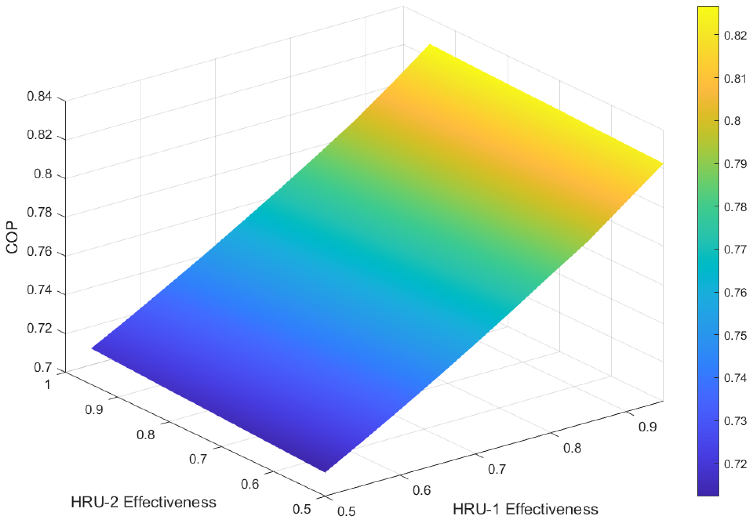 Figure 8 presents a 3D surface plot of COP as a function of heat exchangers, HRU-1 and HRU-2, effectiveness. It is observed that the COP of the cycle is strongly dependent on the effectiveness of HRU-1, with improvement in COP rising from nearly 0.71 to 0.82, respectively, for HRU-1 effectiveness of 0.5 and 0.95. On the contrary, the effectiveness of HRU-2 does not show any significant improvement in the COP of the cycle. Therefore, using HRU-2 in the cycle shown in