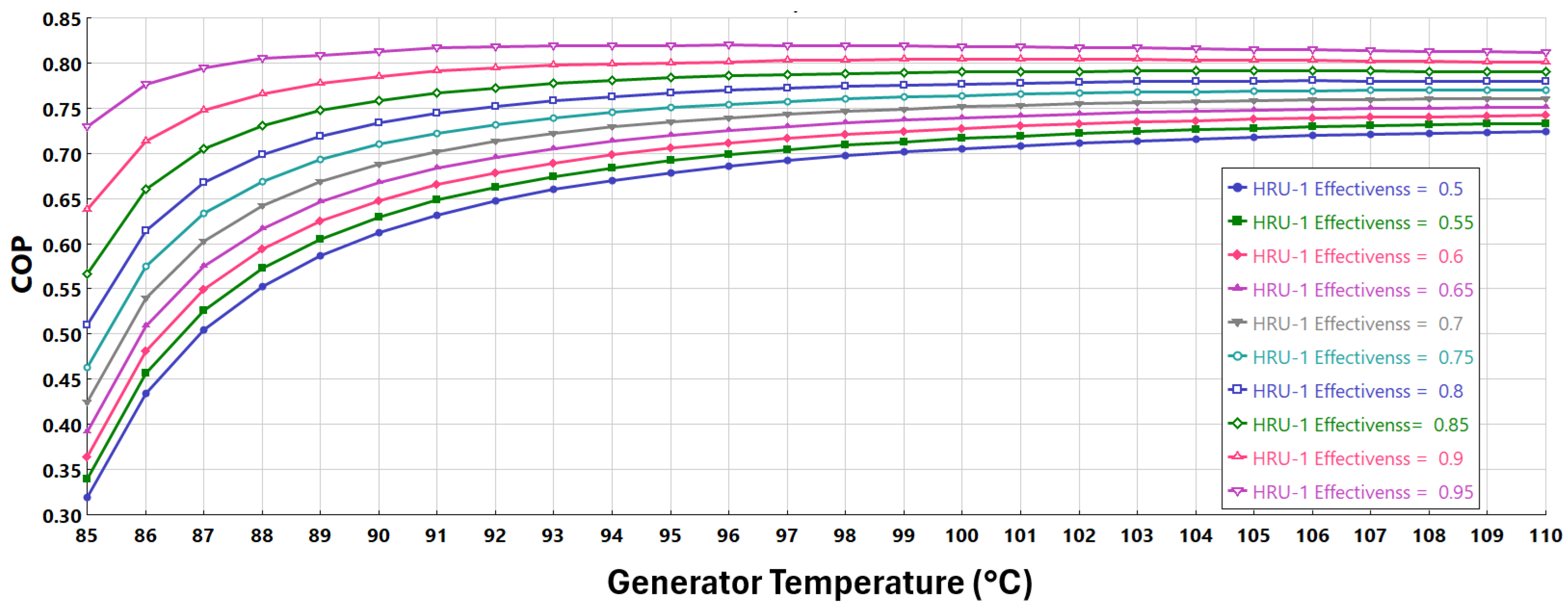 Figure 9 presents the combined effect of generator temperature and HRU-1 effectiveness, ranging from 0.5 to 0.95, on the COP of the cycle. The data presented excludes HRU-2 from the layout, whereas the condenser/absorber operates at 40 °C and the evaporator at 4 °C. Similarly to what is observed previously in