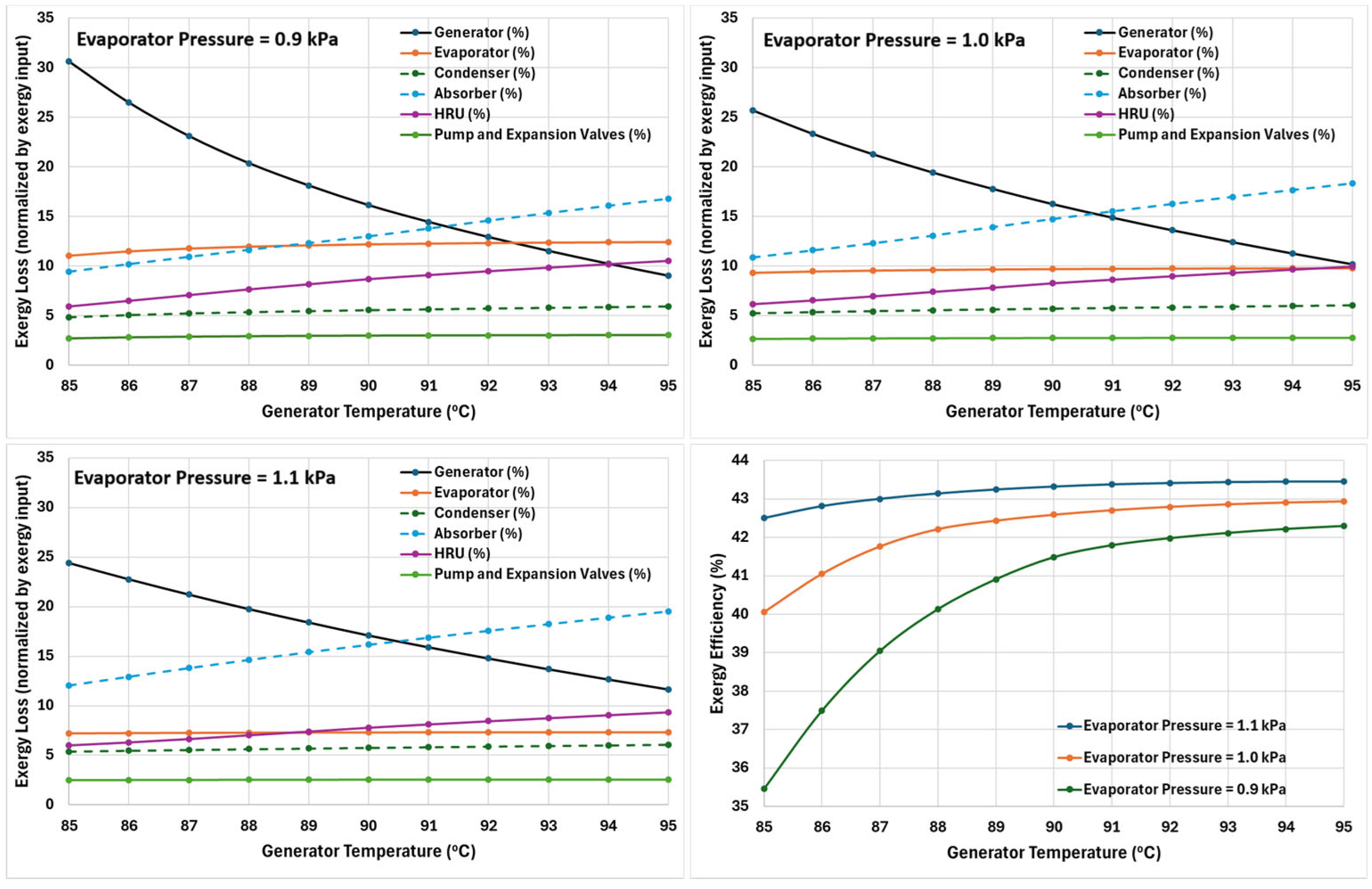 Figure 10, as normalised exergy loss (%) for a range of generator temperatures (85–95 °C) at three evaporator pressures of 0.9, 1.0, and 1.1 kPa (approximately corresponding to evaporator temperatures of 5.5, 7, and 8 °C, respectively). Moreover, the overall exergy efficiency of the cycle is also shown in the same figure.
