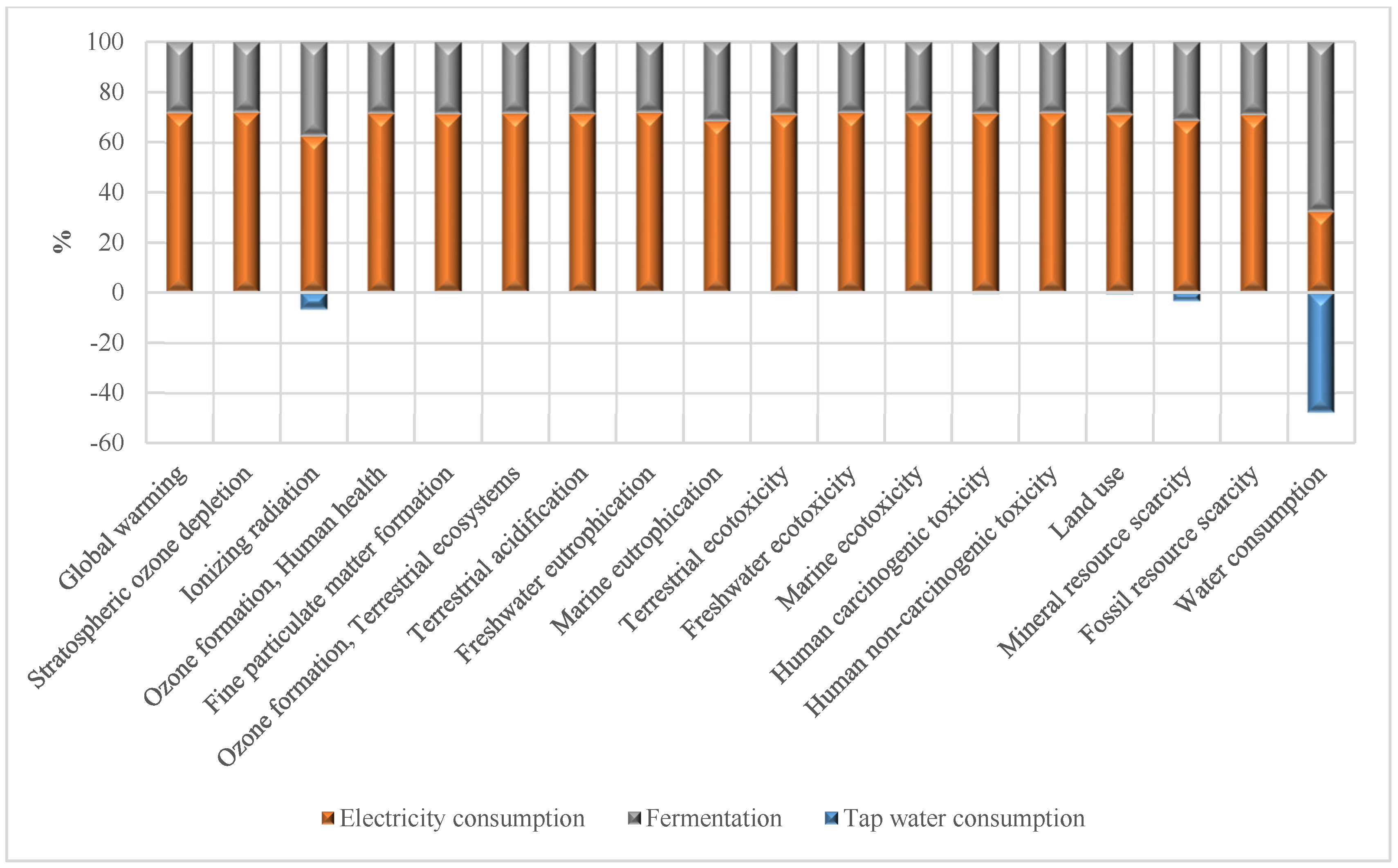 Figure 2, the greatest environmental impact in all 18 impact categories is associated with electricity consumption. This energy is mainly used for the distillation of the post-fermentation solution during the biobutanol enrichment stage. Despite the high share of renewable energy sources (hydroelectric power plants) in Austria’s energy mix, the environmental impact of electricity consumption remains significant. The additional energy impact in the life cycle of the analysed technology results from the use of a nutrient medium in the fermentation process. The nutrient solution contains substances such as KH