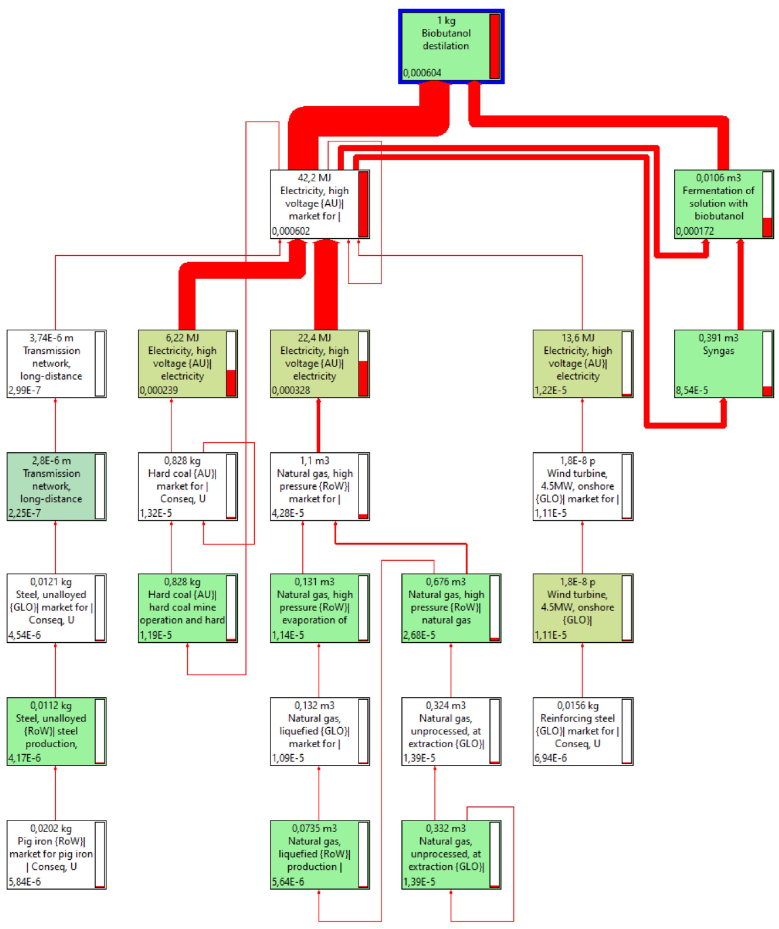 Figure 3). This diagram shows which processes have the greatest negative impact on the final environmental impact of biobutanol production (height of the red bar). The diagram only includes processes whose share is greater than 0.3%. These mainly concern material and energy inputs and greenhouse gas emissions associated with the combustion of fossil fuels to generate electricity, as well as processes related to the production of the feedstock.