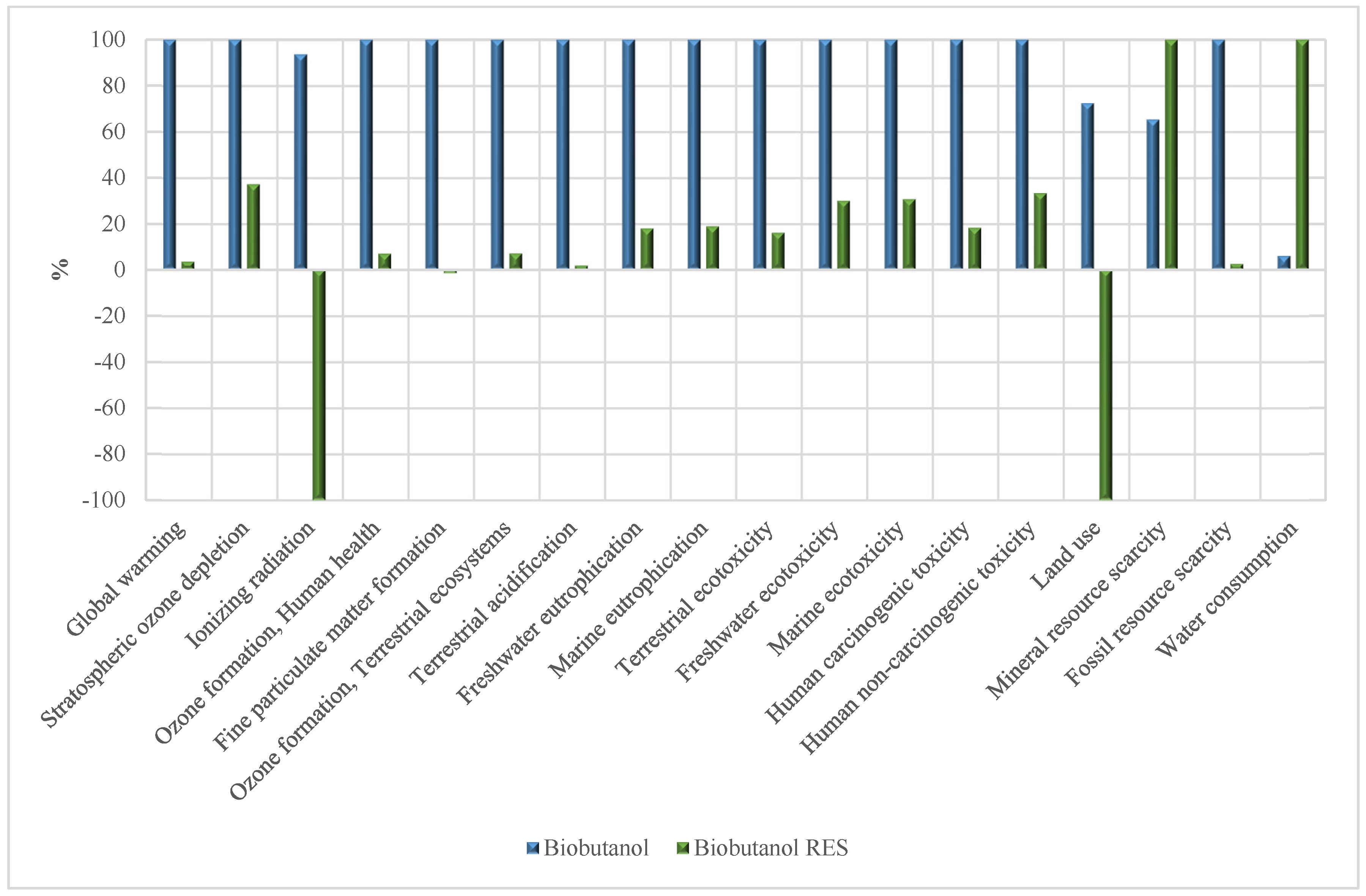 The increased impact of biobutanol production technology using energy from renewable sources compared to the baseline technology in the category of ‘mineral resource scarcity’ is primarily due to the extraction of rare earth elements for the production of photovoltaic cells. As regards the ‘water consumption’ category, its result is influenced not so much by actual water consumption as by the use of water flow in hydropower.