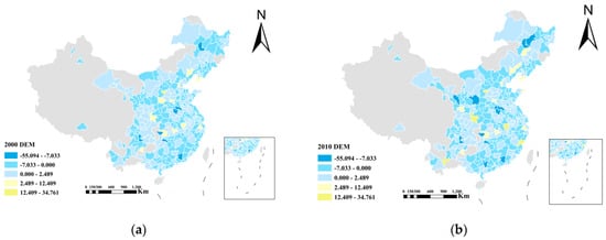 From the perspective of time trend, the regression coefficient between DEM and TCE is negative as a whole, and its mean value continues to decline from 2000 to 2015, from −0.330 to −0.590, indicating that the inhibition of terrain on traffic development has increased significantly during this period. This trend is highly related to the weak urban traffic foundation and limited traffic development in the western region. After 2015, the mean value of DEM coefficient gradually rebounded and reached −0.460 in 2019, indicating that with the continuous improvement of infrastructure in the west (such as the extension of highways and rail transit), the inhibitory effect of topography on carbon emissions has weakened, and even reverse effects have appeared in some cities. Spatially, the southwest and northwest regions have always shown a significant negative correlation, such as Guiyang, Kunming, Lhasa and other places with low coefficients, reflecting that their complex terrain has a strong restriction on traffic activities. However, the eastern coastal cities showed a clear trend of change. In 2000, most cities were still in the negative correlation interval. In 2010, some cities had a coefficient close to 0. By 2019, some cities such as Ningbo, Xiamen, Guangzhou and so on even turned into positive correlation, indicating that the terrain no longer restricts traffic development. Instead, it may push up TCE by extending urban boundaries and increasing commuting distance.