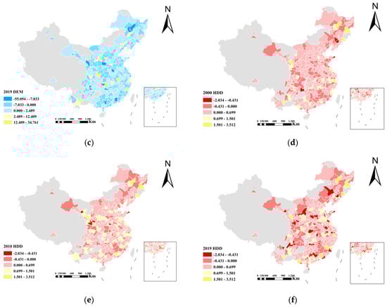 In summary, the regression coefficients of DEM and HDD show a certain trend in time series. The former increases from negative to partially weakened, while the latter experiences a process of rising first and then stabilizing. In space, DEM shows a transition from general inhibition to regional differentiation, while HDD maintains a high-impact area dominated by northern cities.