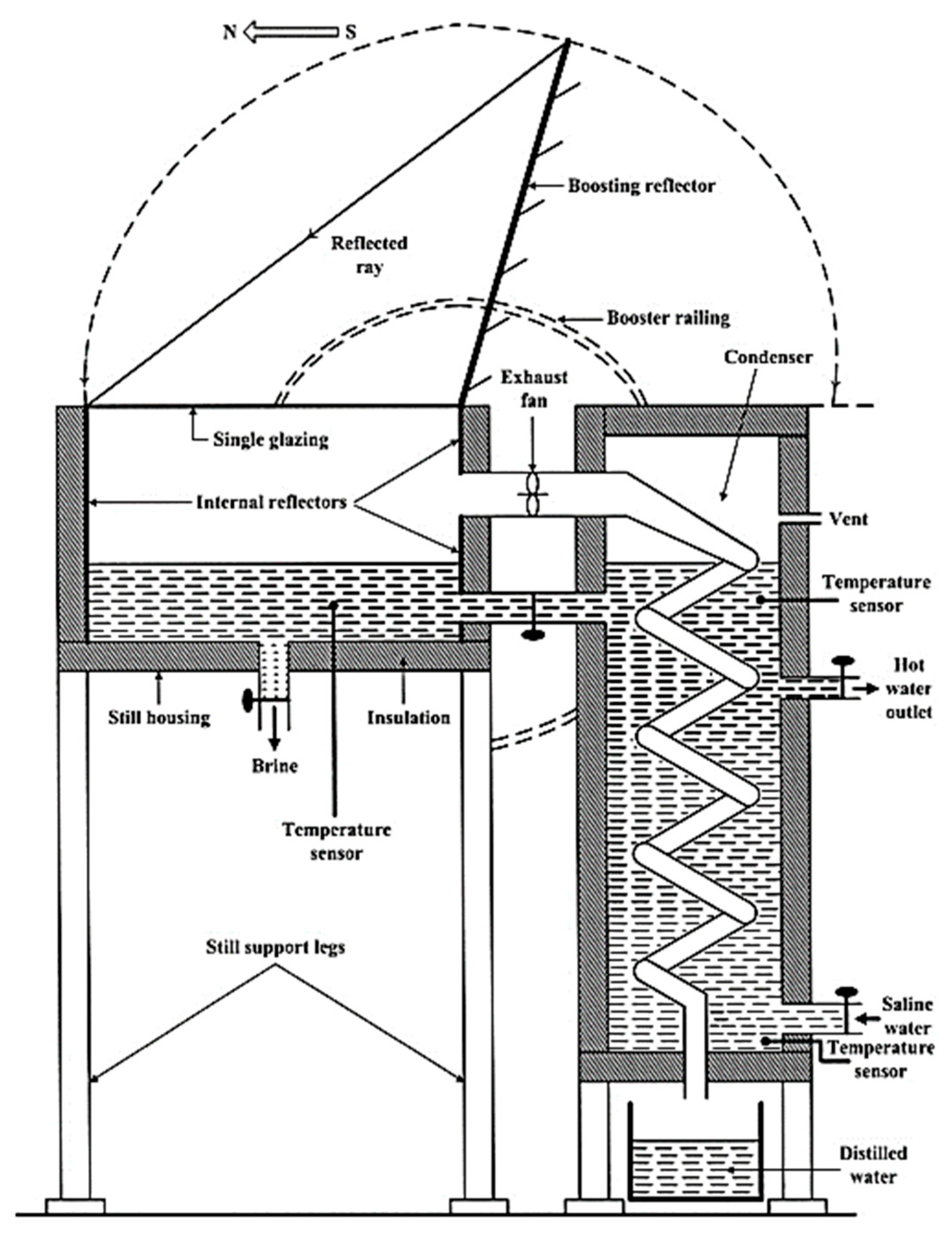 - Ketabchi, F.; Gorjian, S.; Sabzehparvar, S.; Shadram, Z.; Ghoreishi, M.S.; Rahimzadeh, H. Experimental performance evaluation of a modified solar still integrated with a cooling system and external flat-plate reflectors. Sol. Energy 2019, 187, 137–146. [Google Scholar] [CrossRef]