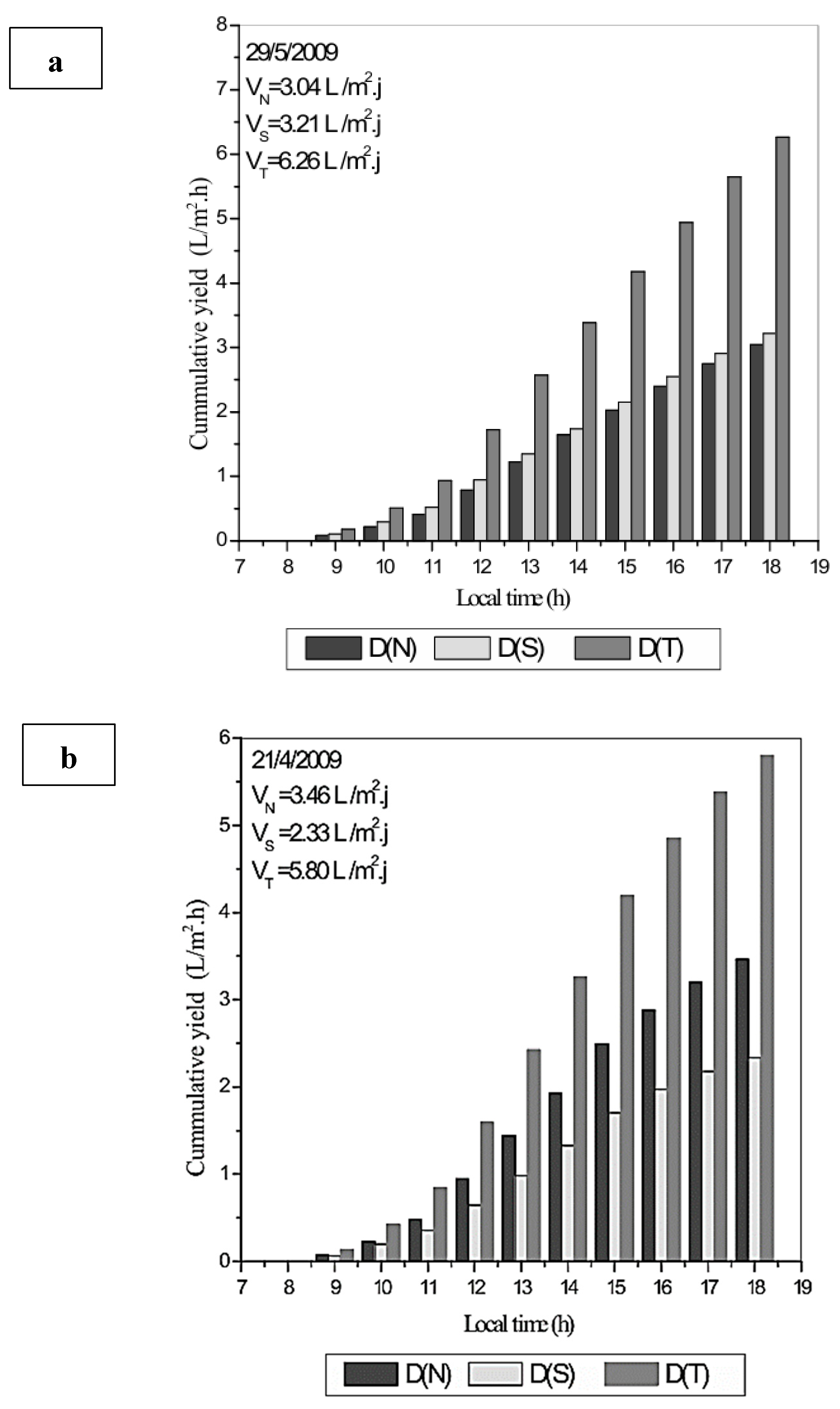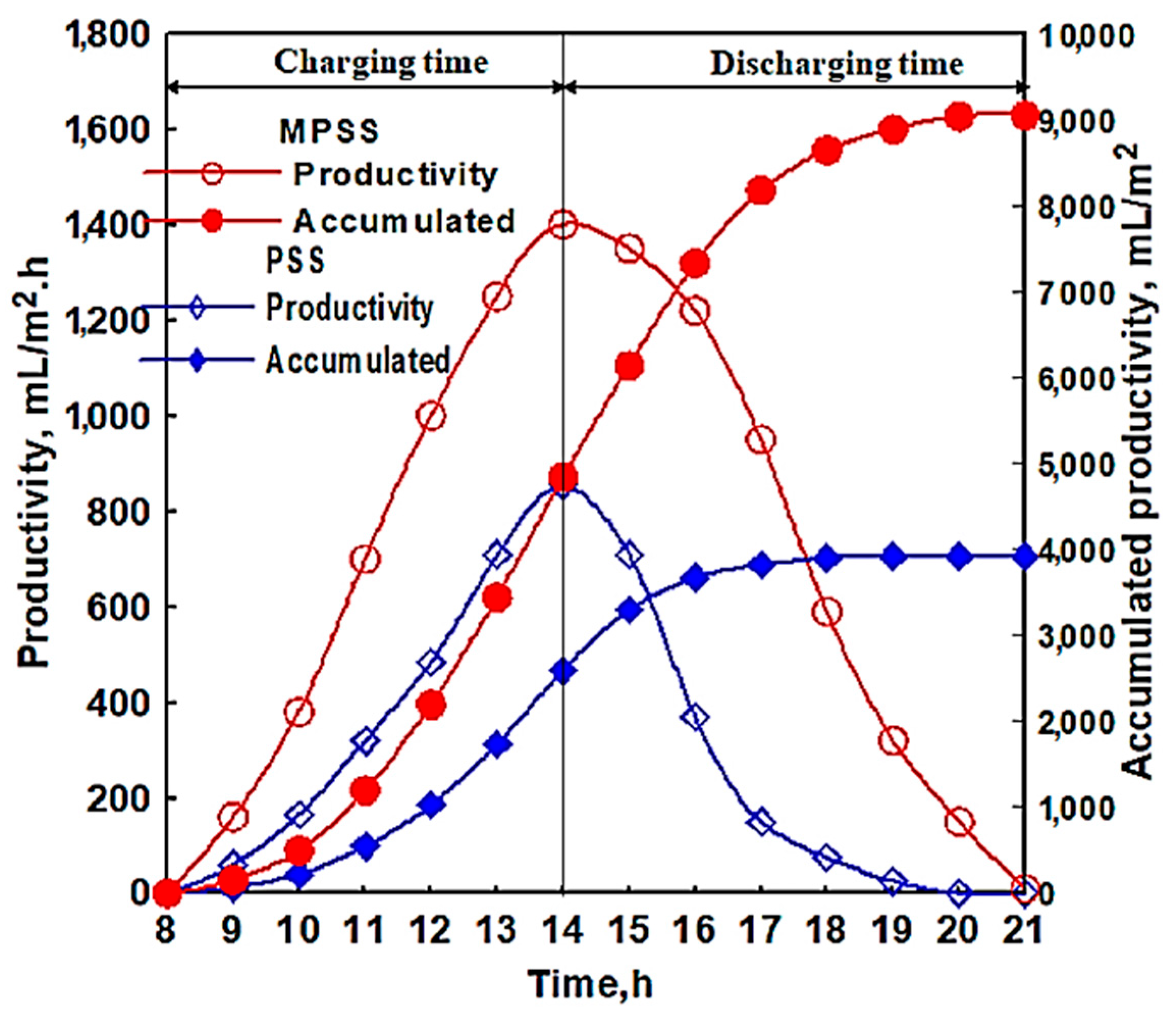 | Zeroual et al. (2011) [47] | Double-slope | Cooling by flowing water or shading on the north glass cover | Daily yield, productivity | Cooling by water improved yield by 11.82%. |