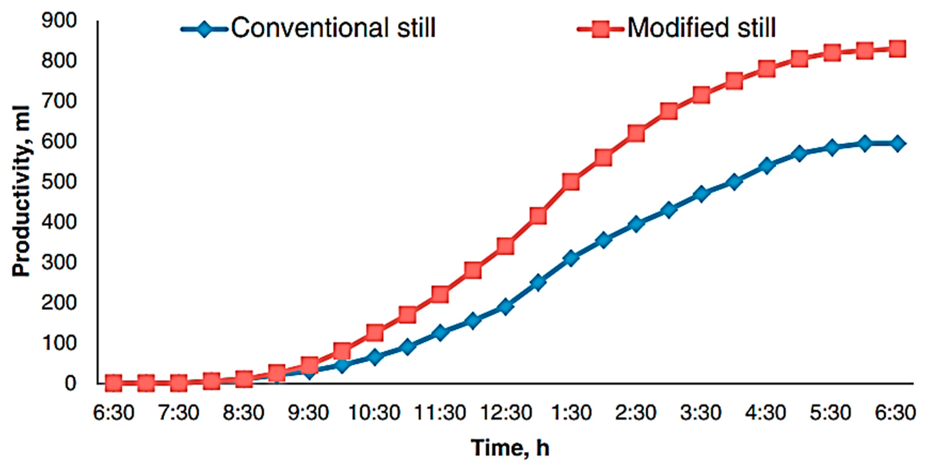 | Rajasekaran and Kulandaivelu (2022) [97] | Modified with inbuilt condenser | Agitator and extended condensing area | Productivity | 98.69% more productivity than conventional. |