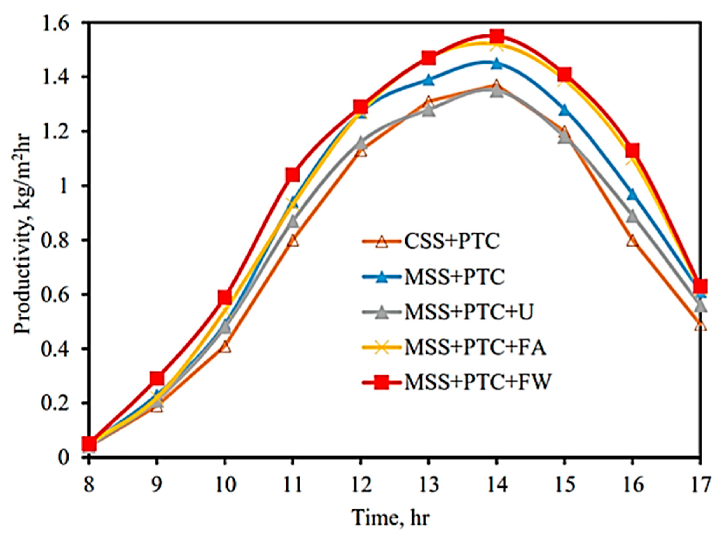 | Hassan et al. (2020) [59] | Solar still with PTSC | PTSC with heat sink condenser and forced air/water cooling | Freshwater yield | 14.8% improvement with HSC and FW cooling. |