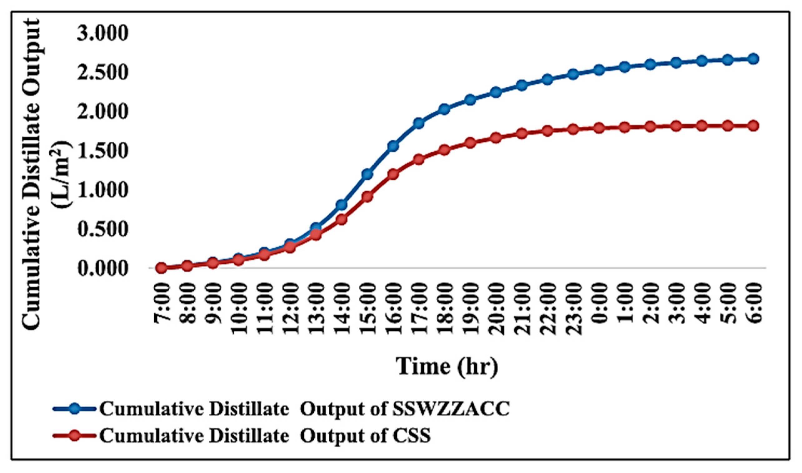 | Naveenkumar et al. (2023) [76] | Double-slope with vacuum fan | Solar-operated vacuum fan, external condenser, and Nanofluids (CuO, Al2O3, ZnO) | Energy, exergy efficiency | 64.29% higher production. |