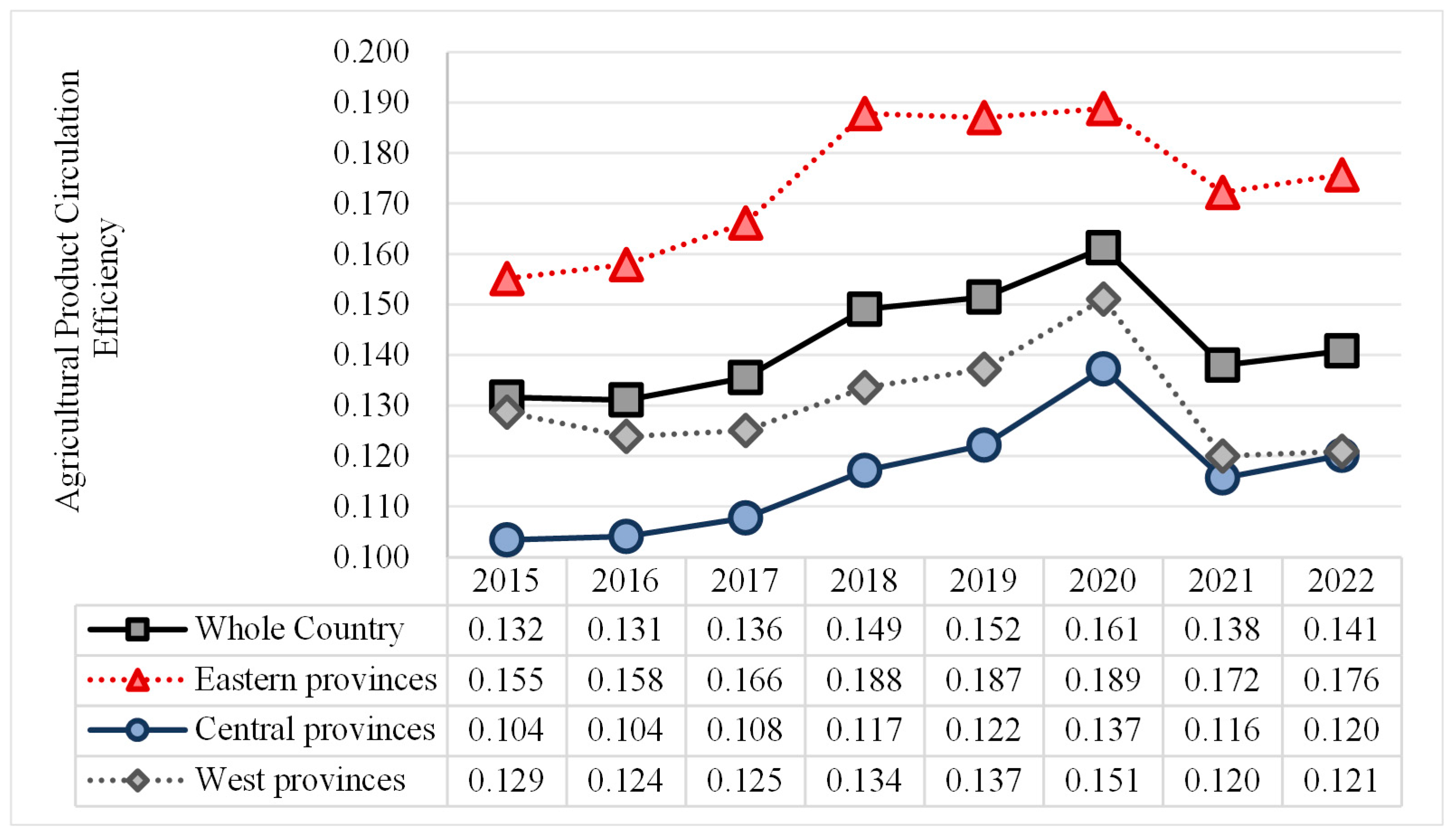 5.1. Descriptive Analysis: Measurement Results of Comprehensive Index of Agricultural Product Circulation Efficiency