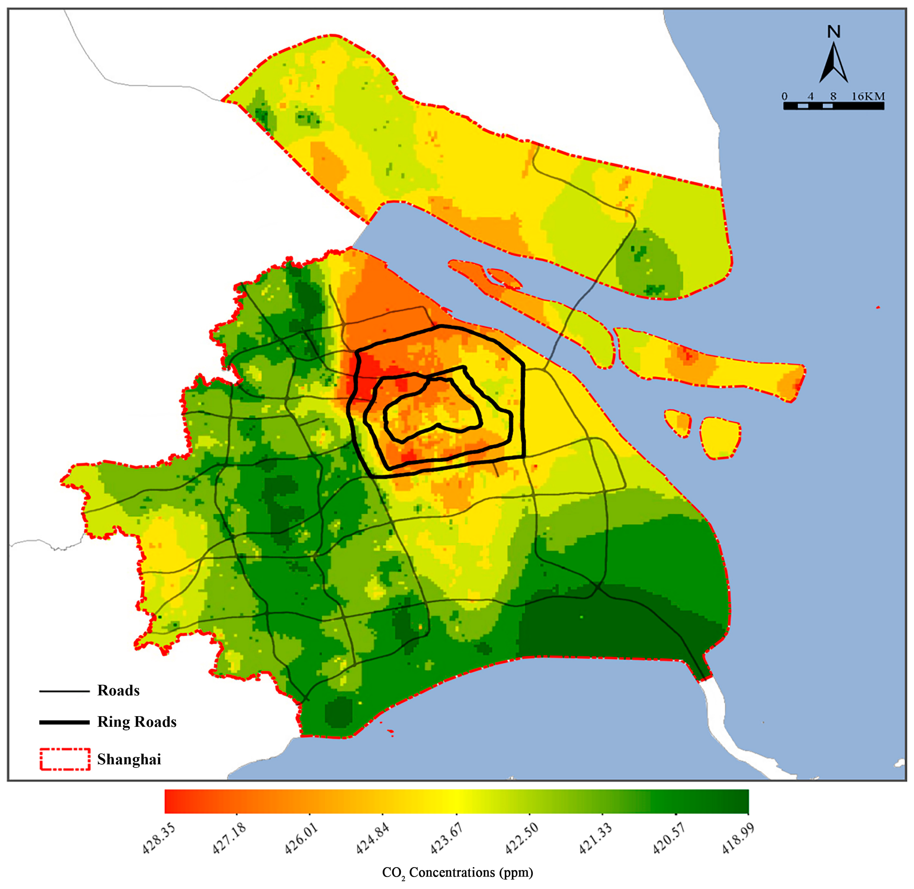 3.1. Spatial Distributions of CO2 Concentration in Shanghai