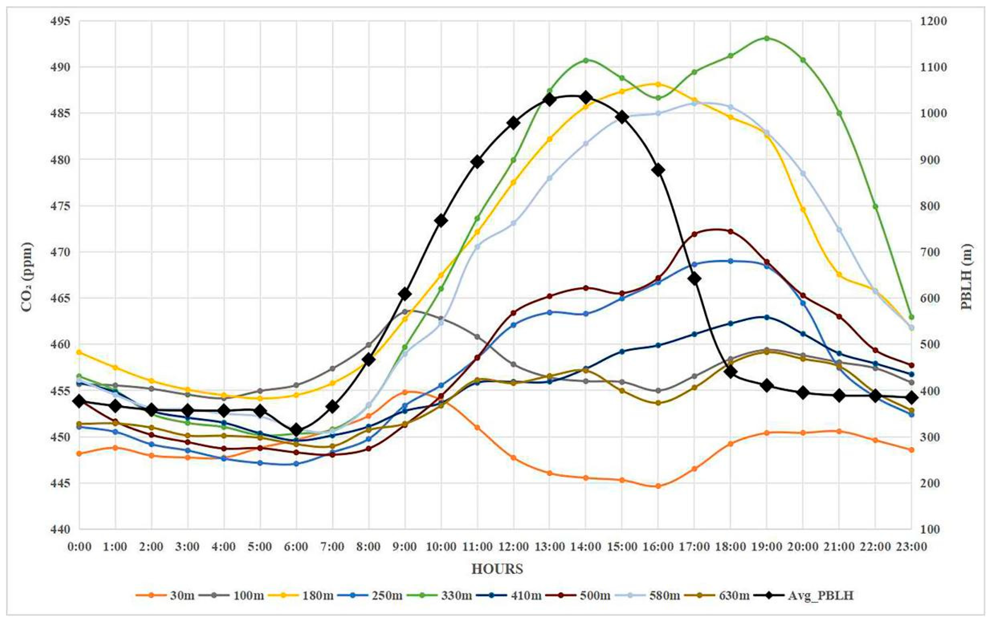 - Li, Y.; Deng, J.; Mu, C.; Xing, Z.; Du, K. Vertical Distribution of CO2 in the Atmospheric Boundary Layer: Characteristics and Impact of Meteorological Variables. Atmos. Environ. 2014, 91, 110–117. [Google Scholar] [CrossRef]