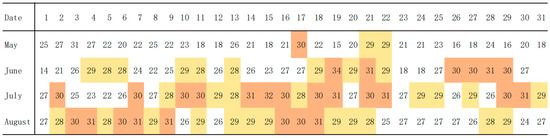 Daily maximum temperature in Changchun from May to August 2024. Source: Meteorological database for thermal environment analysis of Chinese buildings (https://www.tianqi24.com/changchun/history.html (accessed on 20 September 2025)).