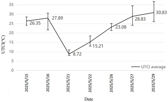 In this study, the Universal Thermal Climate Index (UTCI) was selected as the primary indicator for assessing thermal comfort. UTCI is an internationally recognized dynamic evaluation tool that quantifies thermal exposure by integrating the human body’s thermal balance and regulatory mechanisms. It incorporates key meteorological factors, including air temperature, humidity, wind speed, and solar radiation [50,51,52,58]. UTCI calculation uses relevant calculator simulation results and combines them with field data for correction [59] to enhance the practical applicability and accuracy of the index.