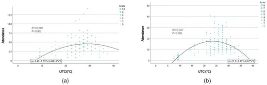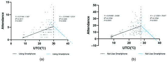 The relationship between Attendance and UTCI; (a) Using smartphones, (b) Not using smartphones.