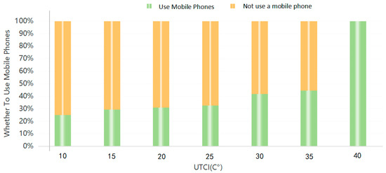 The relationship between whether to use mobile phone proportion and UTCI. (Mobile phone usage rate reaches 100% at 37 °C, and 100% at 40 °C is a predicted value).