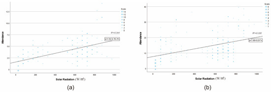 The relationship between attendance and solar radiation (a) Using a mobile phone, (b) Not using a mobile phone.