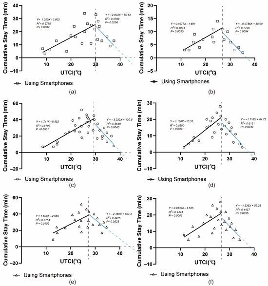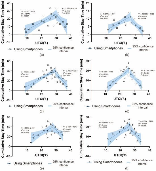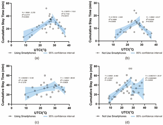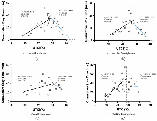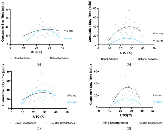 The relationship between cumulative stay time and UTCI (a) using a mobile phone, (b) not using a mobile phone, (c) social activities, (d) optional activities.