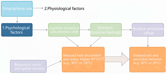 In recent years, research on thermal comfort has evolved from a traditional paradigm centered on physical parameters—such as air temperature, humidity, and wind speed [9,10,11,12,13,14]—toward a multidimensional framework that incorporates both psychological cognition and physiological response [15,16,17,18,19,20,21,22]. In outdoor settings, individuals often select adaptive behaviors—such as seeking shade, reducing physical activity, or limiting exposure time—to maintain thermal comfort. Behavioral thermal adaptation has emerged as a key regulatory mechanism in outdoor thermal regulation within urban environments [23,24,25,26]. Meanwhile, smartphones—a pervasive and immersive medium—are increasingly reshaping how people perceive and engage with public spaces, including their thermal surroundings. Recent studies on park use have moved beyond physical indicators such as vegetation, shading, and accessibility toward a broader understanding of how environmental, social, and informational factors jointly shape outdoor behavior. Park visitation is now seen as the outcome of both thermal comfort and digital engagement, influenced by spatial configuration, accessibility, and demographic differences across seasons [27,28,29]. These findings suggest that public parks operate as hybrid systems where environmental exposure and media interaction co-regulate users’ adaptive behavior. Existing studies indicate that smartphone users often experience a dual state of cognitive immersion [30,31,32,33,34,35] and reduced physical mobility [36,37,38,39,40], potentially resulting in prolonged exposure to uncomfortable thermal conditions and altered thermal tolerance. However, the mechanisms through which smartphone use modulates thermal adaptive behavior remain insufficiently explored. This research gap underscores the importance of systematic empirical investigation into the influence of digital media on thermal responses in outdoor urban environments.