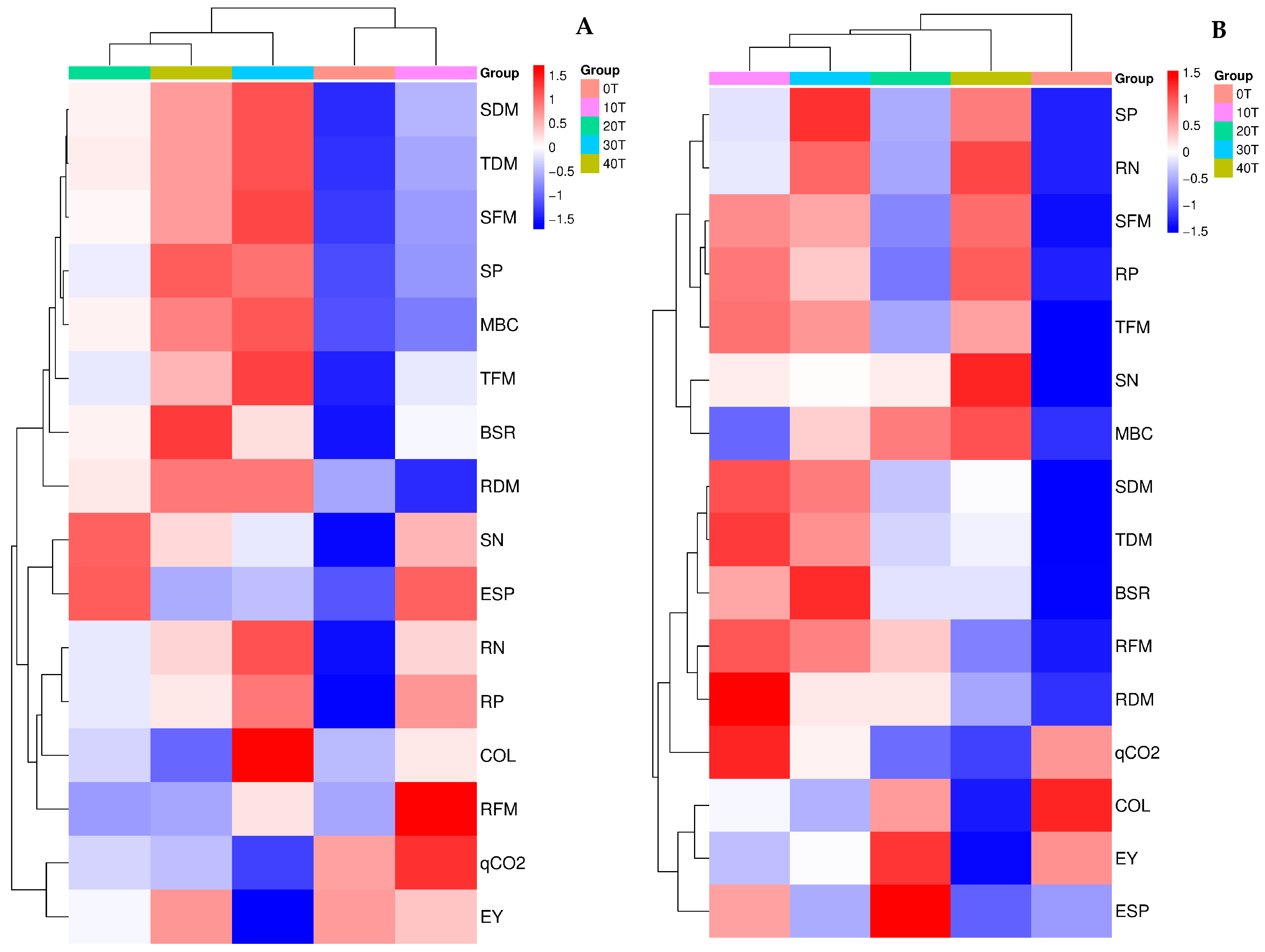 2.4. Determination of Soil Microbial Biomass Carbon, Basal Respiration, and Metabolic Quotient