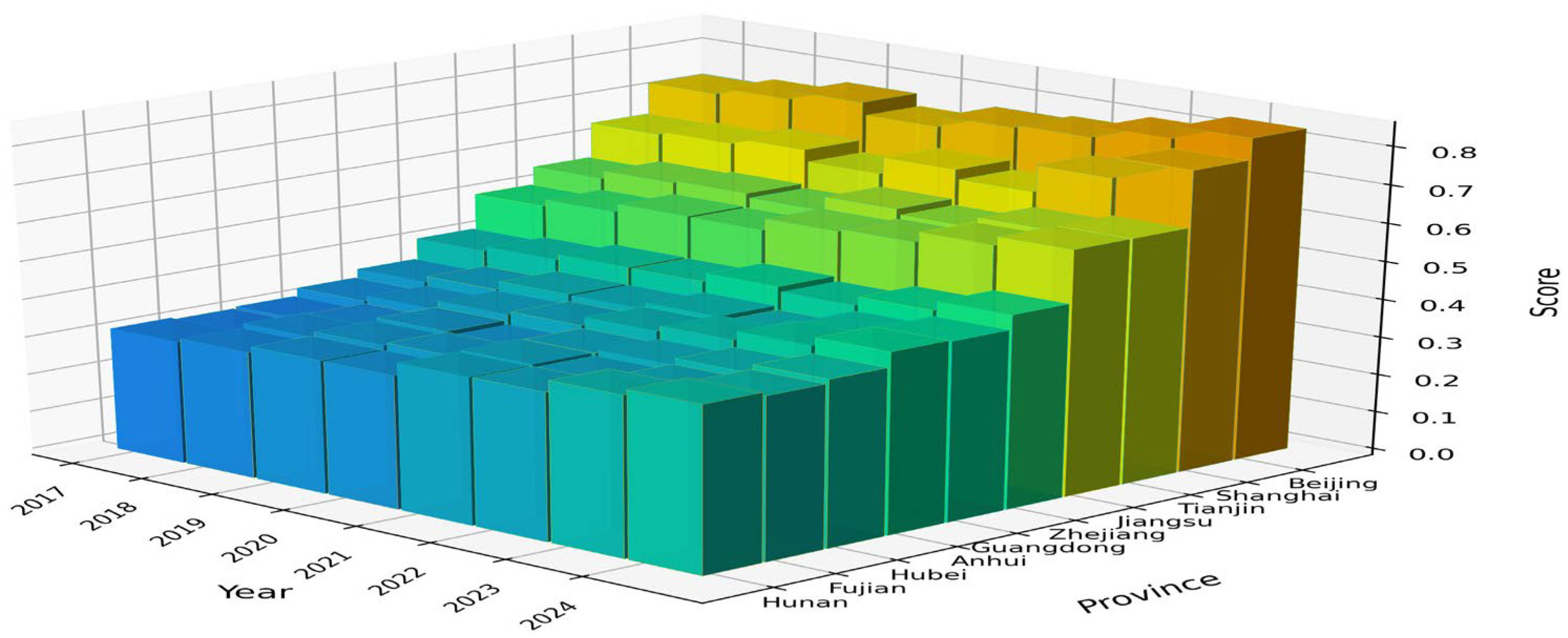 Figure 2 that the scores of each province generally showed a continuous upward trend during this period. The first-tier municipalities such as Beijing, Shanghai and Tianjin were already in a relatively high score range in 2017 and their scores have continued to rise in subsequent years. Economic powerhouses such as Jiangsu, Zhejiang and Guangdong have maintained a stable growth trend. This pattern reflects the imbalance among different provinces in terms of resource endowment, industrial foundation, policy support, etc., providing an intuitive visual support for analyzing regional development momentum and future potential.