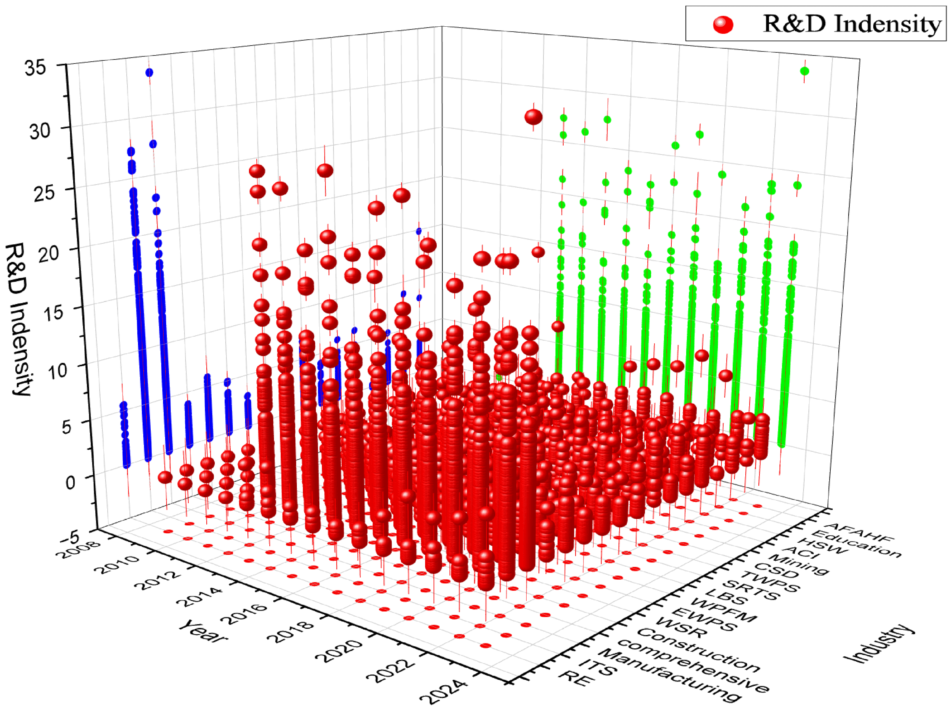 | Mediating (core) | GRDI (RD2) | the intensity and green orientation of firms’ R&D activities. | The Green R&D Intensity Index (GRDI) is constructed using two variables: (i) the annual number of green patent applications, and (ii) total R&D expenditure. Both variables are standardized and subjected to principal component analysis (PCA). The first principal component is extracted and rescaled to the [0, 1] range, representing the intensity and green orientation of firms’ R&D activities.” | Index [0–1] |