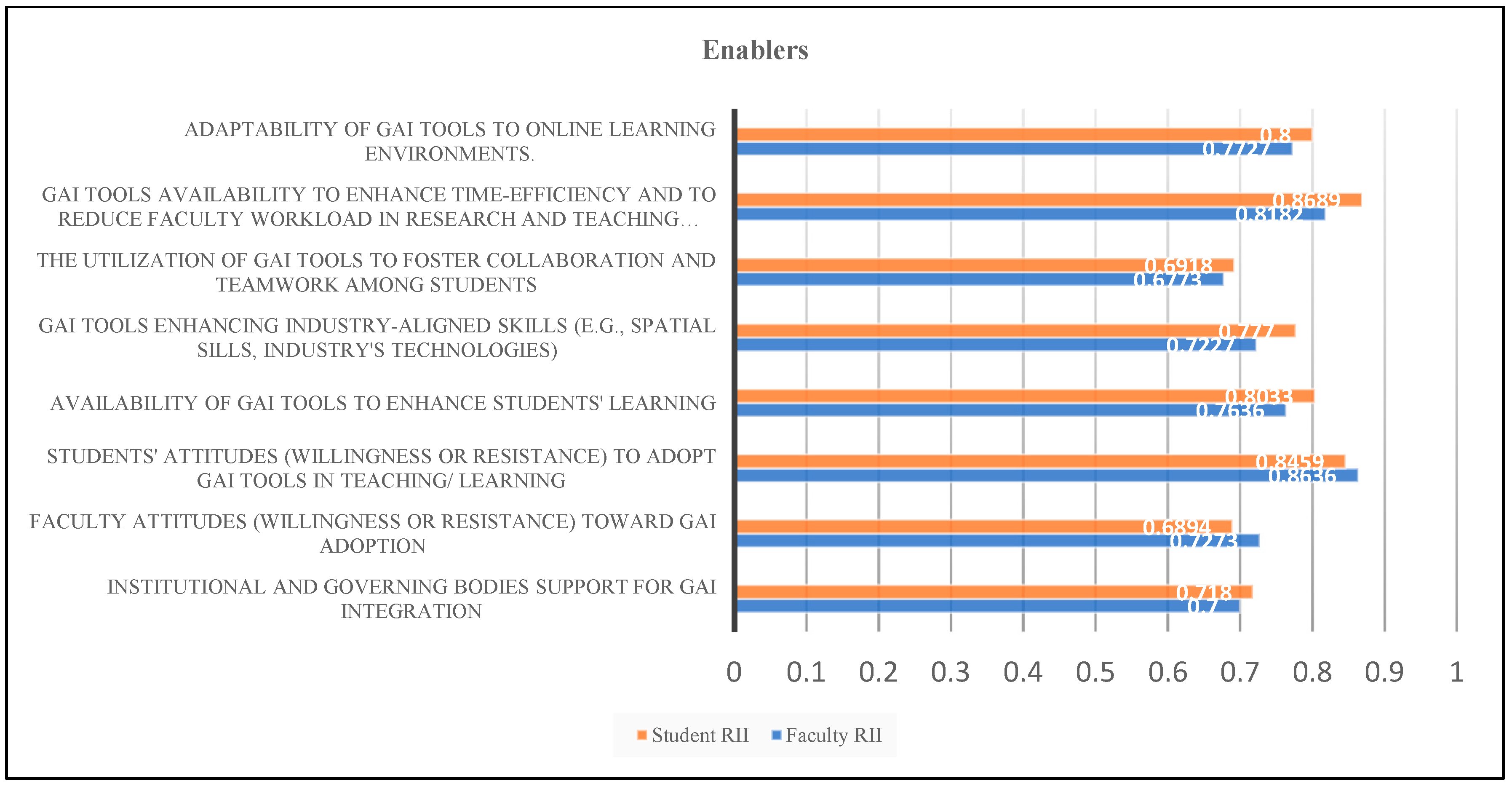 To address the second research question, the RII was applied to systematically quantify and rank the perceived importance of the identified enablers, challenges, strategies, and psychological factors influencing the integration of GAI in MEE. As a robust normalization technique, RII allows a comparative understanding of how various stakeholder groups, students and faculty, prioritize determinants relative to their maximum perceived importance [