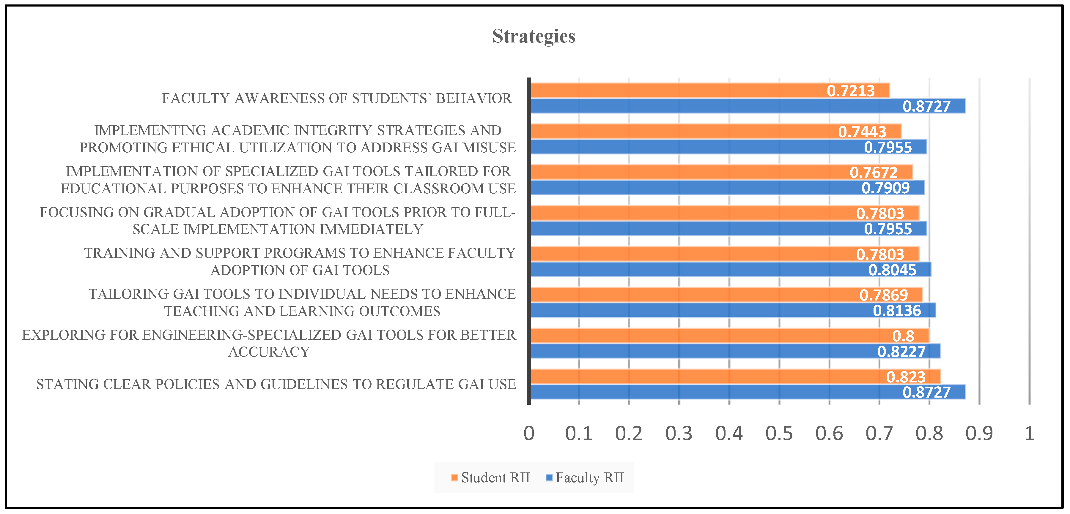 Figure 5 shows a notable convergence between students and faculty regarding strategies for mitigating these challenges. Both rank clear policies and guidelines regulating GAI use as the most important strategy (RII ≈ 0.87), underscoring a shared demand for institutional clarity and ethical governance. However, the nature of their priorities diverges thereafter. Faculty emphasize awareness of student behavior and academic integrity initiatives, aligning with their concern for plagiarism and oversight, whereas students prioritize engineering-specialized GAI tools and tailoring applications to individual needs, emphasizing relevance and personalization.